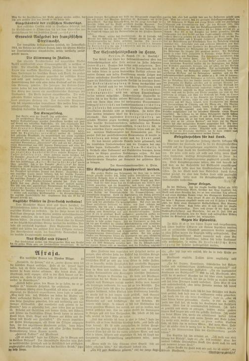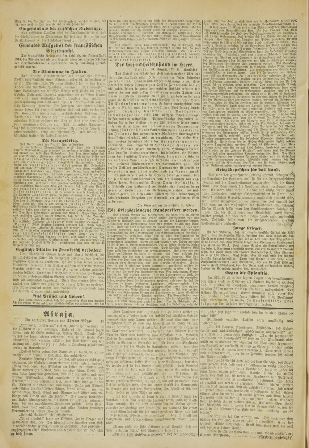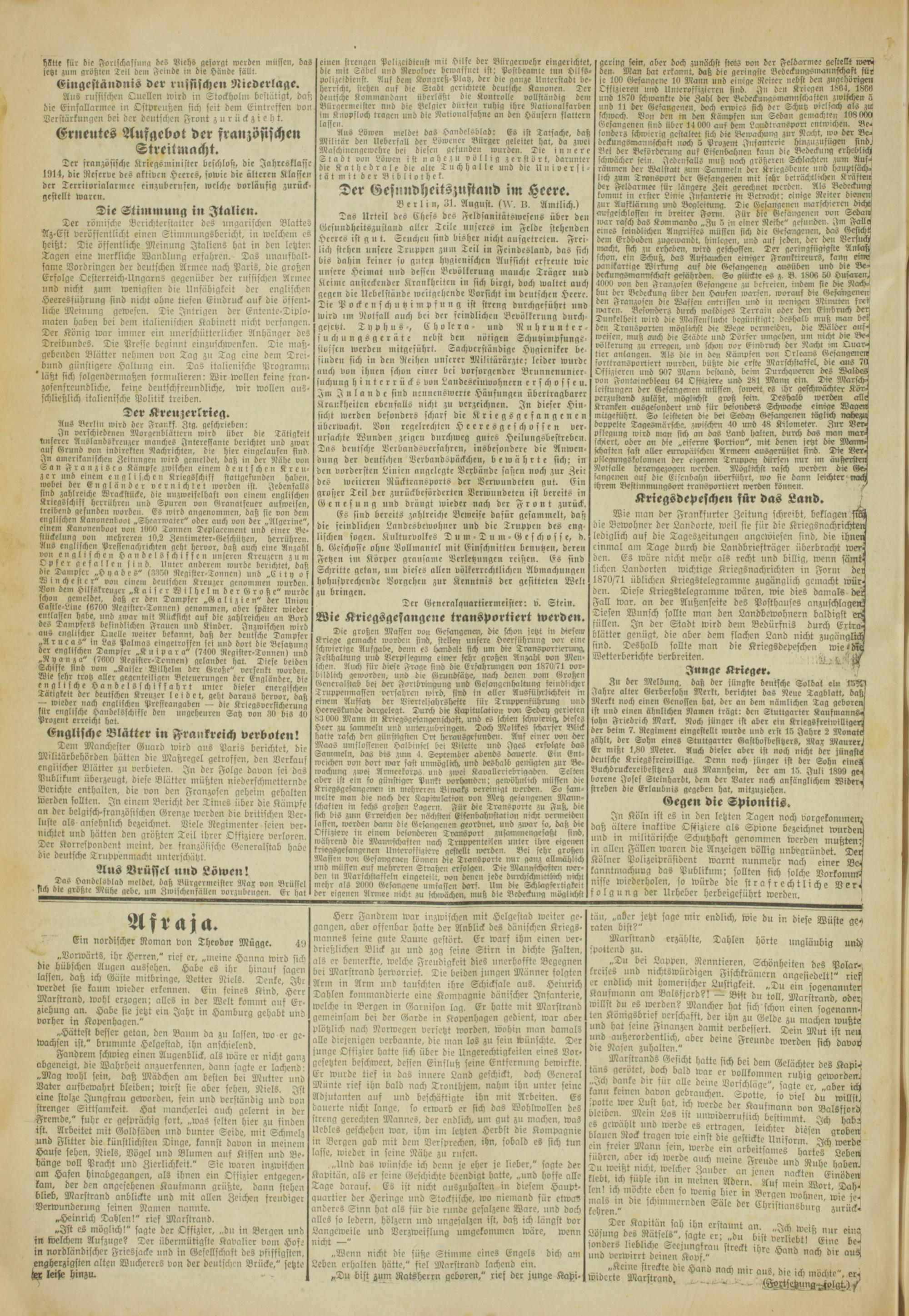 Dem Manchester Guard wird aus Paris berichtet, die Militärbehörden hätten die Maßregel getroffen, den Verkauf englischer Blätter zu verbieten. In der Folge davon sei dos Publikum überzeugt, diese Blätter müßten niederschmetternde Berichte enthalten, die von den Franzosen geheim gehalten werden sollten. In einem Bericht der Times über die Kämpfe an der belgisch-französischen Grenze werden die britischen Der- luste als ansehnlich bezeichnet. Viele Regimenter seien vernichtet und hätten den größten Teil ihrer Offiziere verloren. Der Korrespondent meint, der französische Generalstab habe die deutsche Truppenmacht unterschätzt.