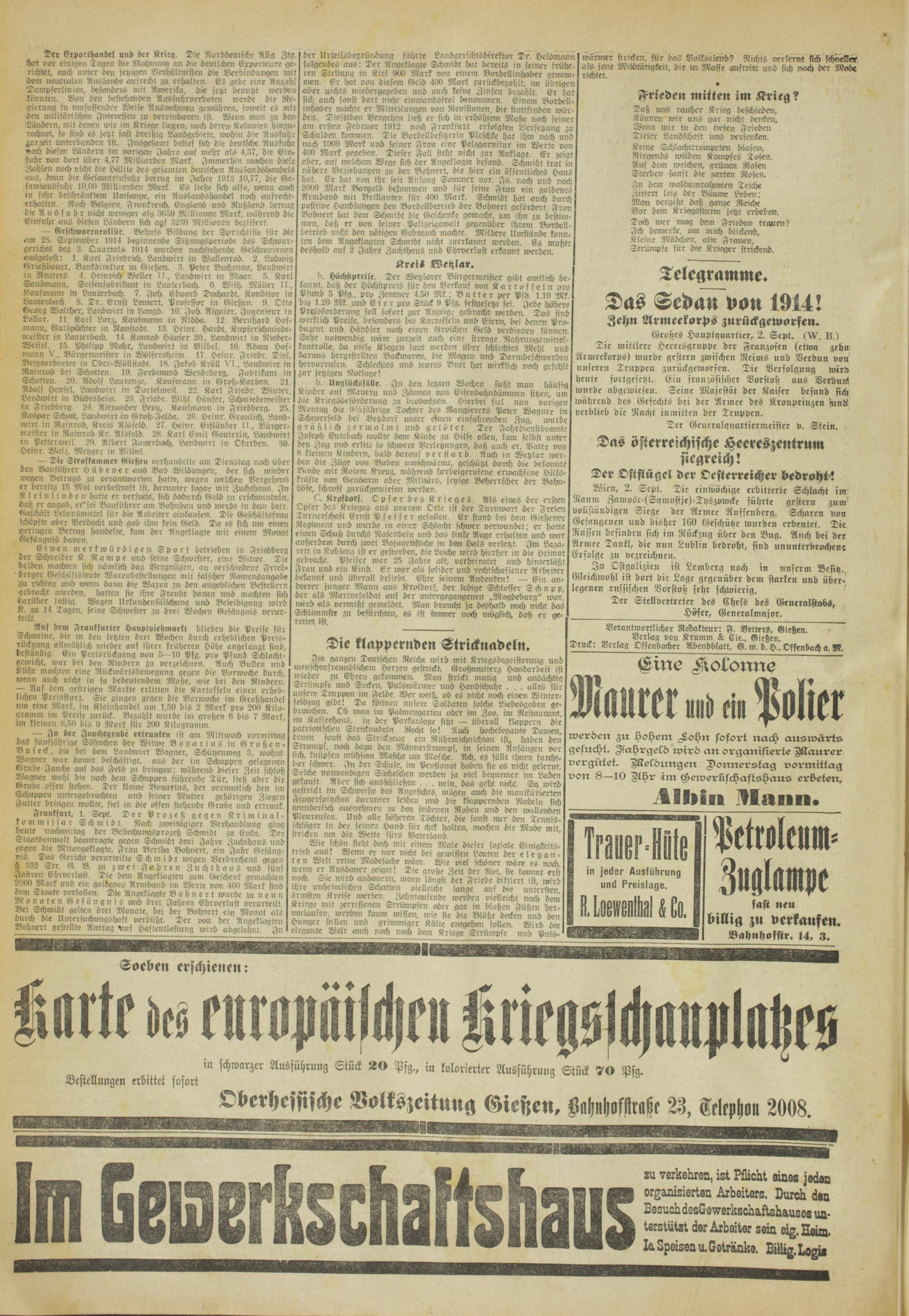 — Gcschworcncnliste. Behufs Bildung der Spruchliste für di« am 28. September 1814 beginnende Sitzungsperiode des Schwurgerichts des 3. Quartals 1814 wurden nachstehende Geschworenen atisgelost: 1. Karl Friedrich, Landwirt in Wallenrod. 2. Ludwig Grießbauer, Bankdircktor in Gießen. 3. Peter Biicheiiart, Landwirt i» Reuters. 4. Heinrich Weller II., Landwirt in Maar._ 5. Karl Sandmann, Slisensabrikant in Laulerbach 6. Wilh. Möller II,, Kaufmann in Lautcrbach. 7, Ich, Eduard Duchardt, Konditor in Lanterbach. 8. Tr, Ernst Lentert, Proftsior in Gieße». 8. Otto Georg Walther, Landwirt in Langd, 18. Iah Aigaier, Ingenieur in Lollar. 11. Karl Lorz, Kaufniami in Nidda. 12. Bernhard Hof- inann, Kulspächter in Ranstadt, 13. Heinr. Hardt, Kupferschmiede- meister in Lautcrbach. 14. Äonrad Häuser 28., Landivirt in Nieder- Weiscl. 15. Philipp Mohr, Landwirt in Vilbel. 18. Adam Hos- inann V., Blirgerineistcr in Wölfersheim 17. Heinr. Friedr, Diel, Beigeordneter in Qbcr-Wöllstadt. 18. Jakob Kröll VI., Landivirt in Rainrod bei Schotten. 18. Ferdinand Wendcbcrg, Fabrikant in Echvttcit. 28. Adolf Laurenze, Kaitsmann in Groß-Kärben. 21. Adolf Hansel, Landivirt m Torlelivcil. 22. Karl Friedr, Winter, Landwirt in Bsidesheii». 23. Friedr, Wihl. Häuser, Schmiedemeister iti Friedberg. 24. Alexander Leon, Kaufmann in Friebberg. 25, Kaspar Tck-att, Landwirt in Groß.Felda. 28. Heinr. Graulich. Landivirt in Rainrod, Kreis Alsfeld. 27. Heinr. Eifländcr II, Bürgermeister rn Rainrod Kr. Alsfeld. 28. Karl Emil Gauterin, Landwirt in Petterweil. 28. Albert Fauerbach, Landwirt l» Lkarbcn, 36. Heinr. Walz, Metzger in Bildet.