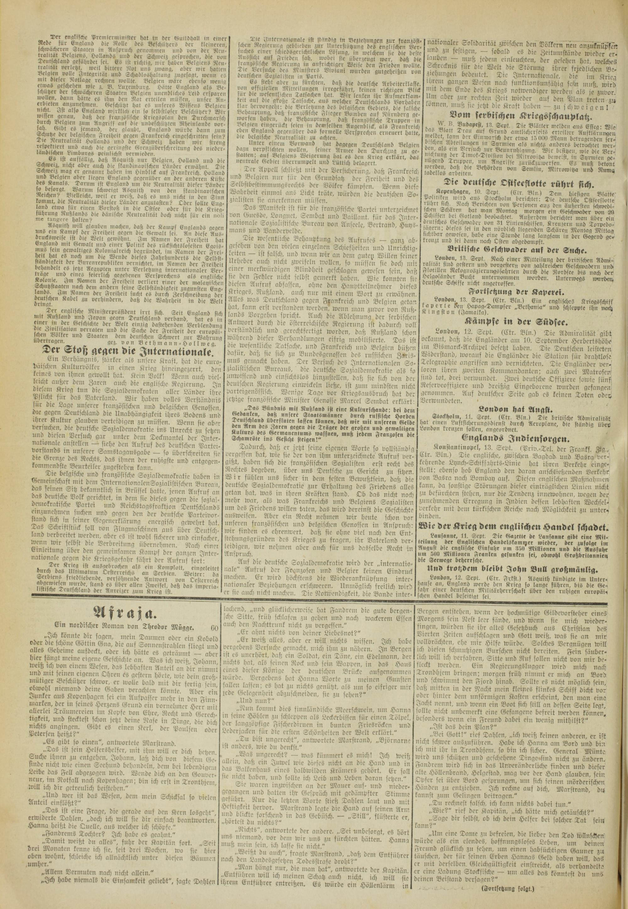 Ein Verhängnis, stärker als unsere Kraft, hat die europäischen Kulturvölker in einen Krieg hincingczcrrt, den keines von ihnen gewollt hat. Kein Volk! Wenn auch vielleicht außer dem Zaren auch die englische Regierung. In diesem Krieg tun die Sozialdemokraten aller Länder ihre Pflicht für das Vaterland. Wir haben volles Verständnis für die Lage unserer französischen und belgischen Genossen, die gegen Deutschland die Unabhängigkeit ihres Bodens und ihrer Kultur glauben verteidigen zu müssen. Wenn sie aber versuchen, die deutsche Sozialdemokratie ins Unrecht zu setzen und diesen Versuch gar unter dem Deckmantel der Inter- nationale anstellcn — siche den Ausruf des deutschen Partei- Vorstands in unserer Samstagausgabc — so überschreiten sie die Grenze des Rechts, das ihnen der ruhigste und entgegenkommendste Beurteiler zugestehcn kann.