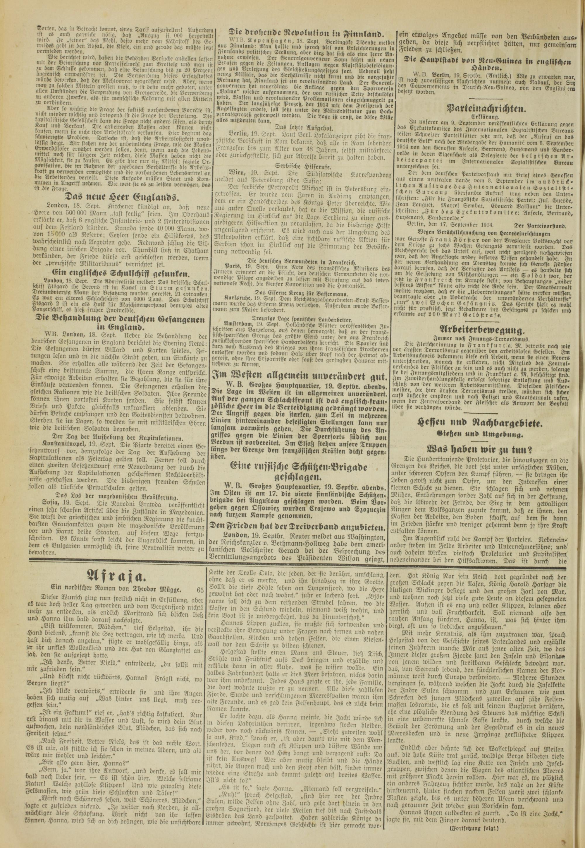 W. B. Großes Hauptquartier, 19. Septbr. abends. Im Osten ist am 17. die vierte finnländische Schützenbrigade bei Augustow geschlagen worden. Beim Vorgehen gegen Ossowiez wurden Crajewo und Szozuczin nach kurzem Kampfe genommen.