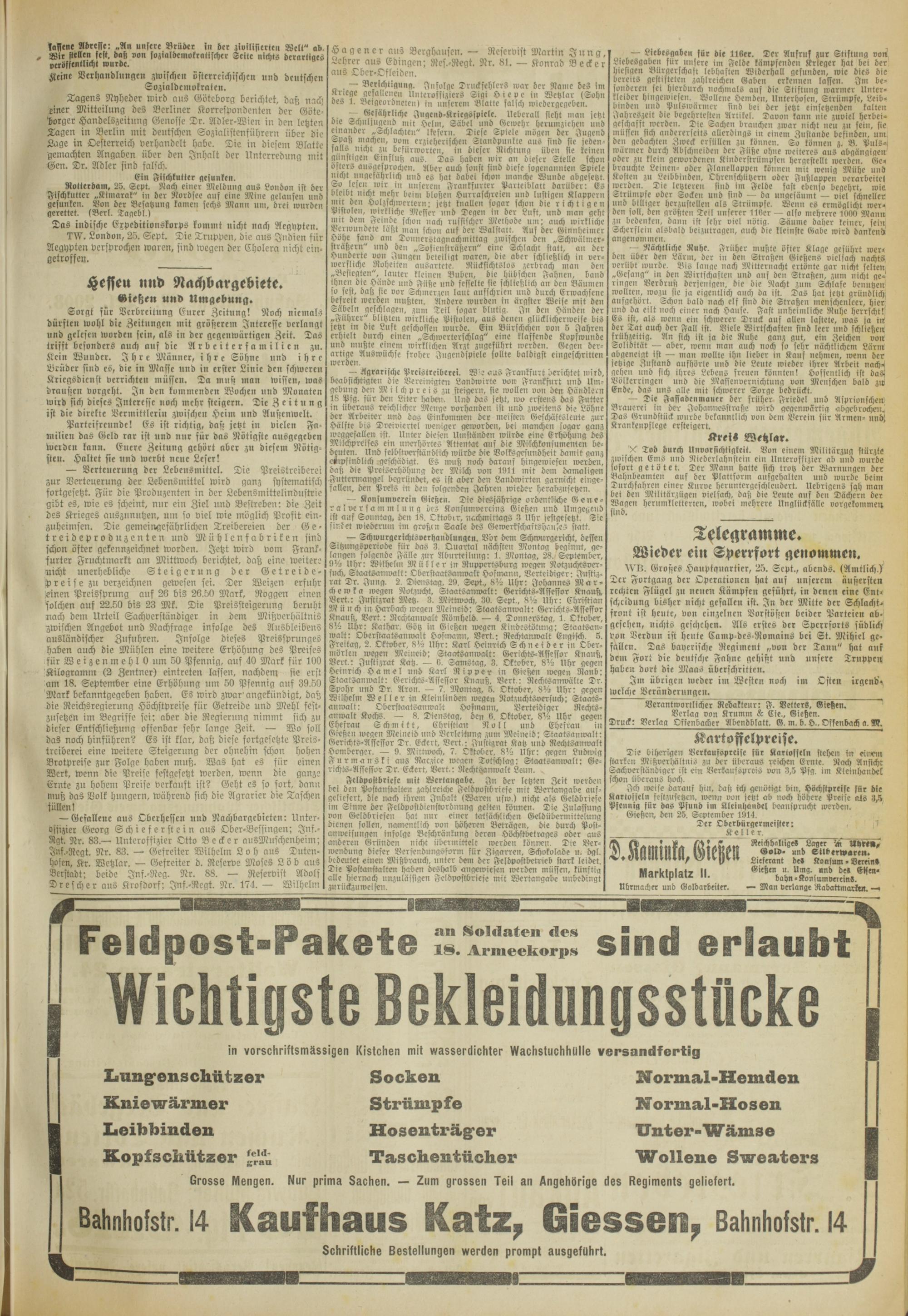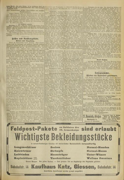 — Gefallene aus Obcrhcssen und Nächbargcbictcu: Unterossizier Georg Schiefer st ein aus Ober-Bessingen; Inf.- Ngt. Nr. 83.— Unteroffizier Otto Becker ausMufchcnheim; Jnf.-Rcgt. Nr. 83. — Gefreiter Wilhelm Loh aus Dutenhofen, Kr. Wetzlar. — Gefreiter d. Reserve Moses L ö b aus Berstadt; beide Jnf.-Reg. Nr. 88. — Reservist Adolf Drescher aus Krofdorf: Jnf.-Rcgt. Nr. 174. — Wilhelm