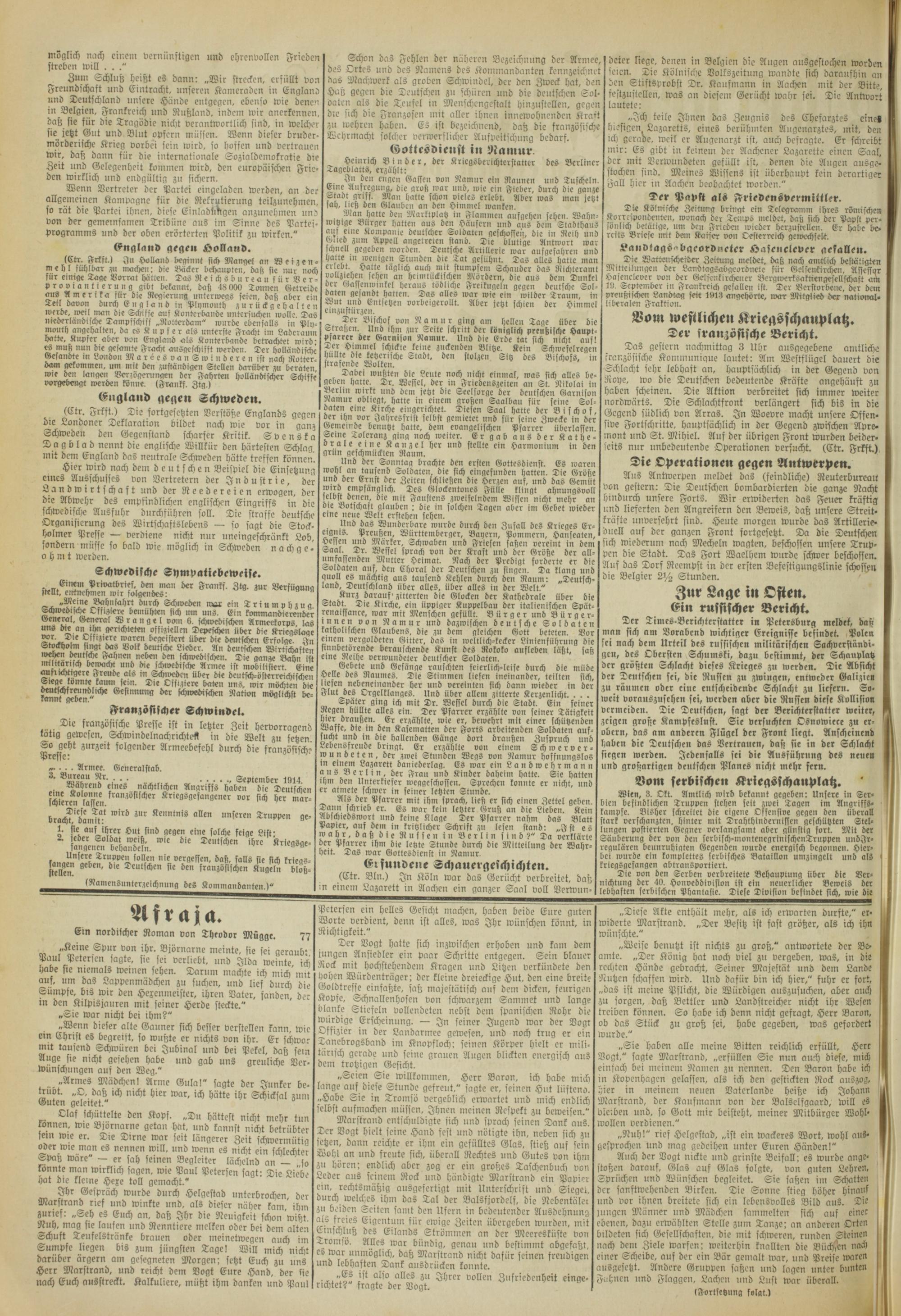 Zum Schluß heißt es dann: „Wir strecken, erfüllt von Freundschaft und Eintracht, unseren Kameraden in Englanü und Deutschland unsere Hände entgegen, ebenso wie denen in Belgien, Frankreich und Rußland, indem wir anerkennen, daß sie für die Tragödie nicht verantwortlich sind, in welcher sie jetzt Gut und Blut opfern müssen. Wenn dieser bruder- mörderische Krieg vorbei sein wird, so hoffen und vertrauen wir, daß dann für die internationale Sozialdemokratie die Zeit und Gelegenheit kommen wird, den europäischen Frieden wirklich und endgültig zu sichern.