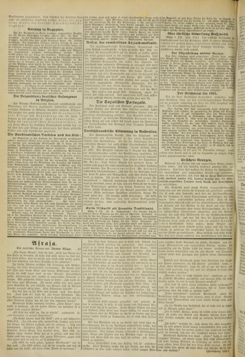 Der Reichspost wird aus Mailand gedrahtet: „Wie die hiesigen Blätter aus Mailand über Lissabon melden, haben die radikalen Sozialisten der portugiesischen Cortes eine gemeinsame Kundmachung erlassen. Das Manifest fordert „in letzter Stunde" zu strengster Neutralität Portugals im eng- tischen Krieg ans und richtet sich sonach gegen die Forderung des Dreiverbandes, daß Portugal seine Truppen Frankreich zu Hilfe sende.