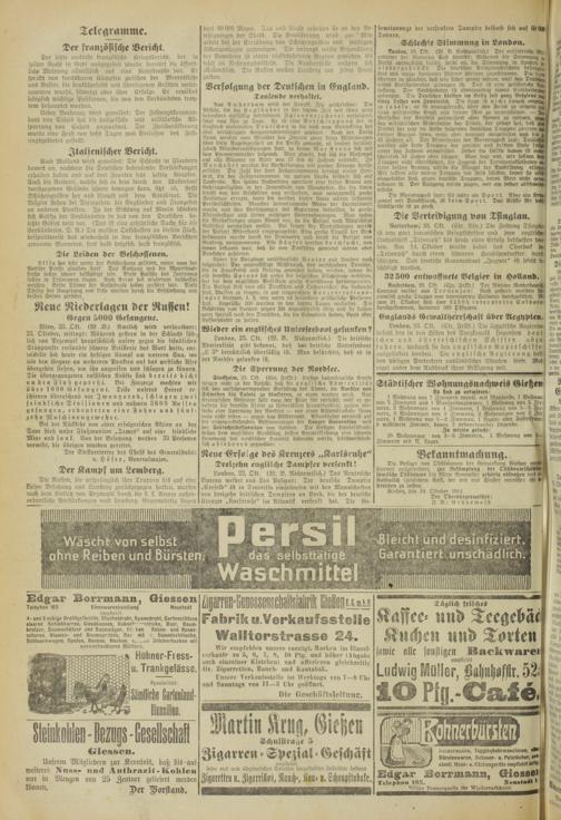 lieber die Vorgänge veröfsentlicht Reuter aus London noch folgendes: Der augenfällige Mißbrauch, den, verschiedene Deutschs, die in Frankreich und Belgien gewohnt haben, trieben, indeni sie als deutsche Spione sich unter die belgischen Flüchtlinge mischte«, hat bei dein englischen Publikum große Entrüstung hervorgernseit. Die Polizei Keß nun alle Deutschen und Oestcrreichcr, die imstande sind, Waffen zu tragen, in gut eingerichtet- Konzen tratiou s - lagcr bringen, d. h. nur wenn es besonders gefährliche Personen sind. Ungefähr 100 wurden in den letzten Tagen verhaftet. Die Behörden von London zeigen sich ungewöhnlich tätig und sie suchen ganz speziell nach den Deutschen, die die Erlaubnis haben, Bars oder Kaffeehäuser zu halten.