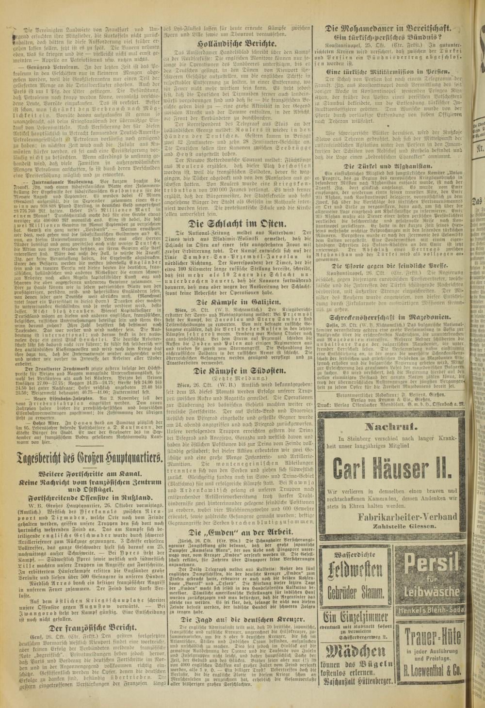 W. B. Großes Hauptquartier» 21i. Oktober vormittags. (Amtlich.) Westlich des Nserknnnls zwischen Nicn- poort und Dix müden, welche Orte noch vom Feinde gehalten werden, grissen unsere Truppen den sich dort noch hartnäckig wehrenden Feind an. Das am Kampfe sich bc- teiligendc englische Geschwader wurde durch schweres Arlillerieseucr zu», Rückzüge gezwungen, 3 Schisse erhielten Volltreffer, das ganze Geschwader hielt sich daraus am 25. nachmittags außer Schußweite. — Bei B p r e s steht der Kamps. — Südwestlich Upres sowie westlich und südwestlich Lille machte» unsere Truppen im Angriffe gut Fortschritte. In erbittertem Hänscrkampsc erlitten die Engländer große Verluste nnd ließen über 500 Gcsaiigcnc in unseren Händen.