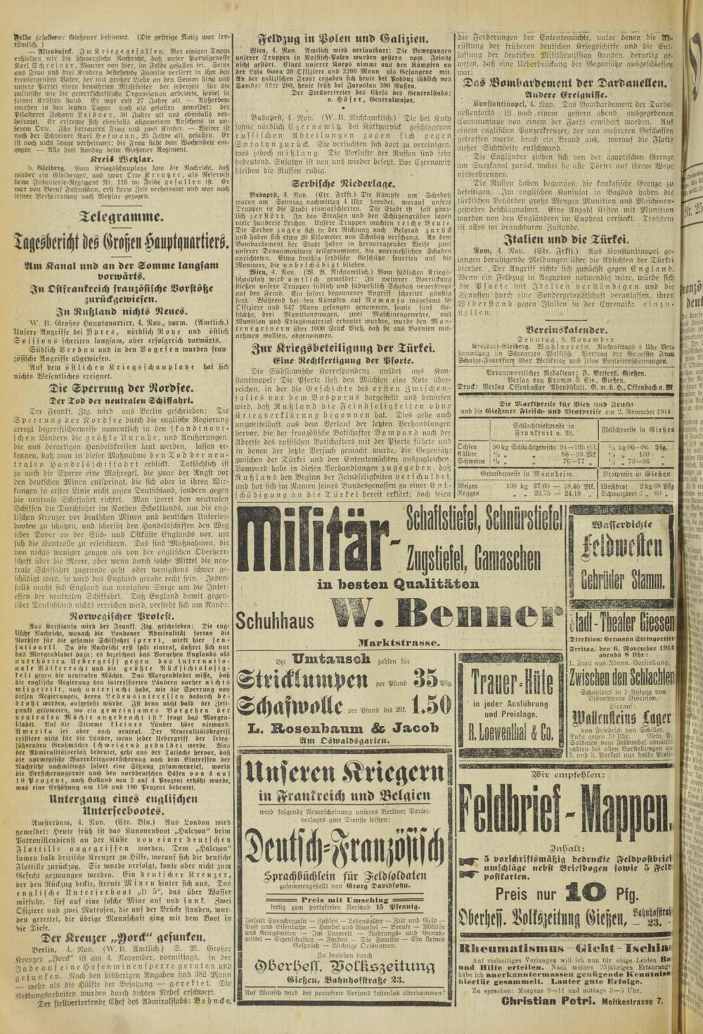 \V. B. Großes Hauptquartier, 4. Nov., vorm. (Amtlich.> Unsere Angrisse bei Up res, nördlich Rohe und östlich Soissons schreiten langsam, aber erfolgreich vorwärts.