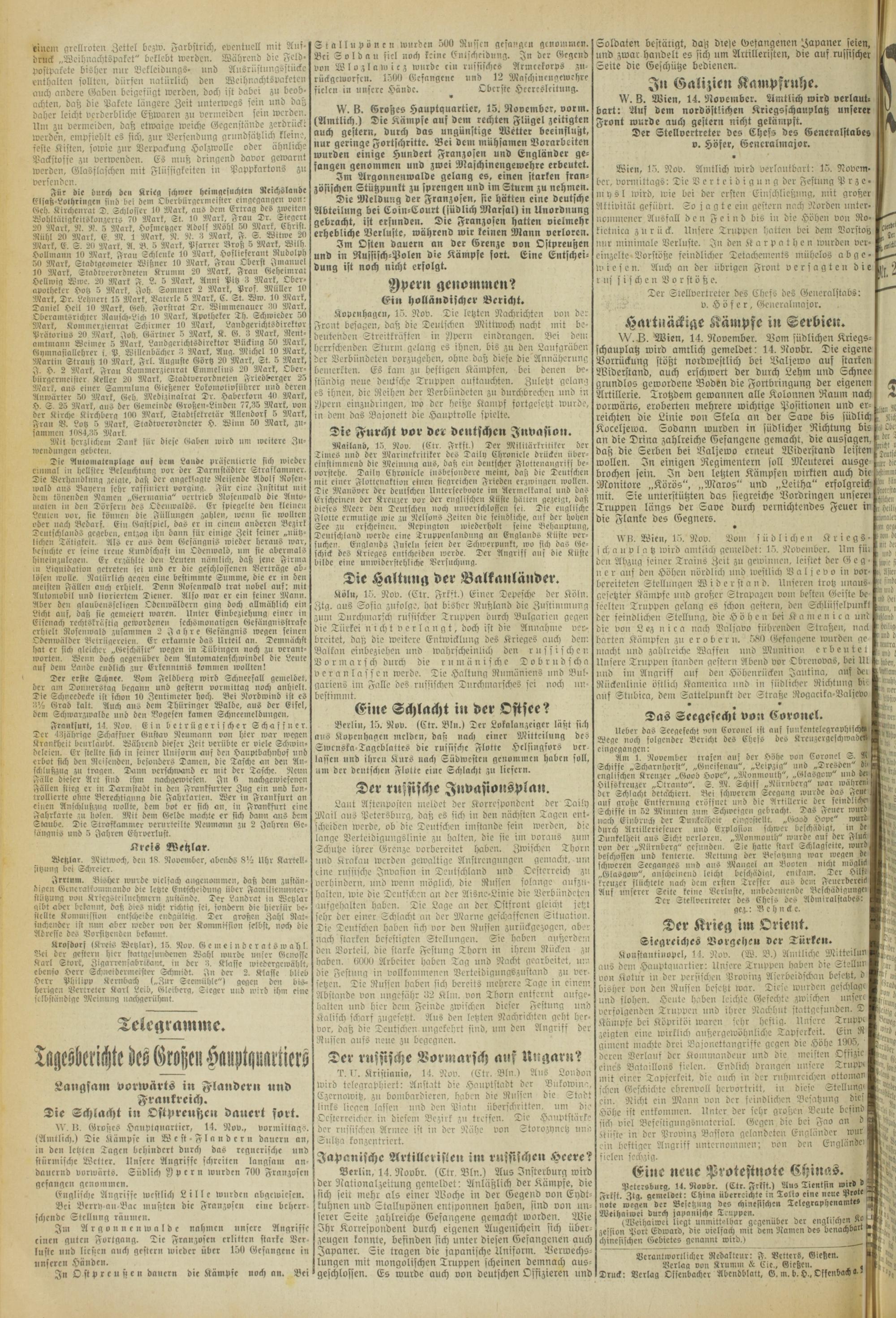 W. B. Grosses Hauptquartier, 15. November, vorm. (Amtlich.) Die Kämpfe auf dem rechten Flügel zeitigten auch gestern, durch das ungünstige Wetter beeinflußt, nur geringe Fortschritte. Bei dem mühsamen Vorarbeiten wurden einige Hundert Franzosen und Engländer gefangen genommen und zwei Maschinengewehre erbeutet.
