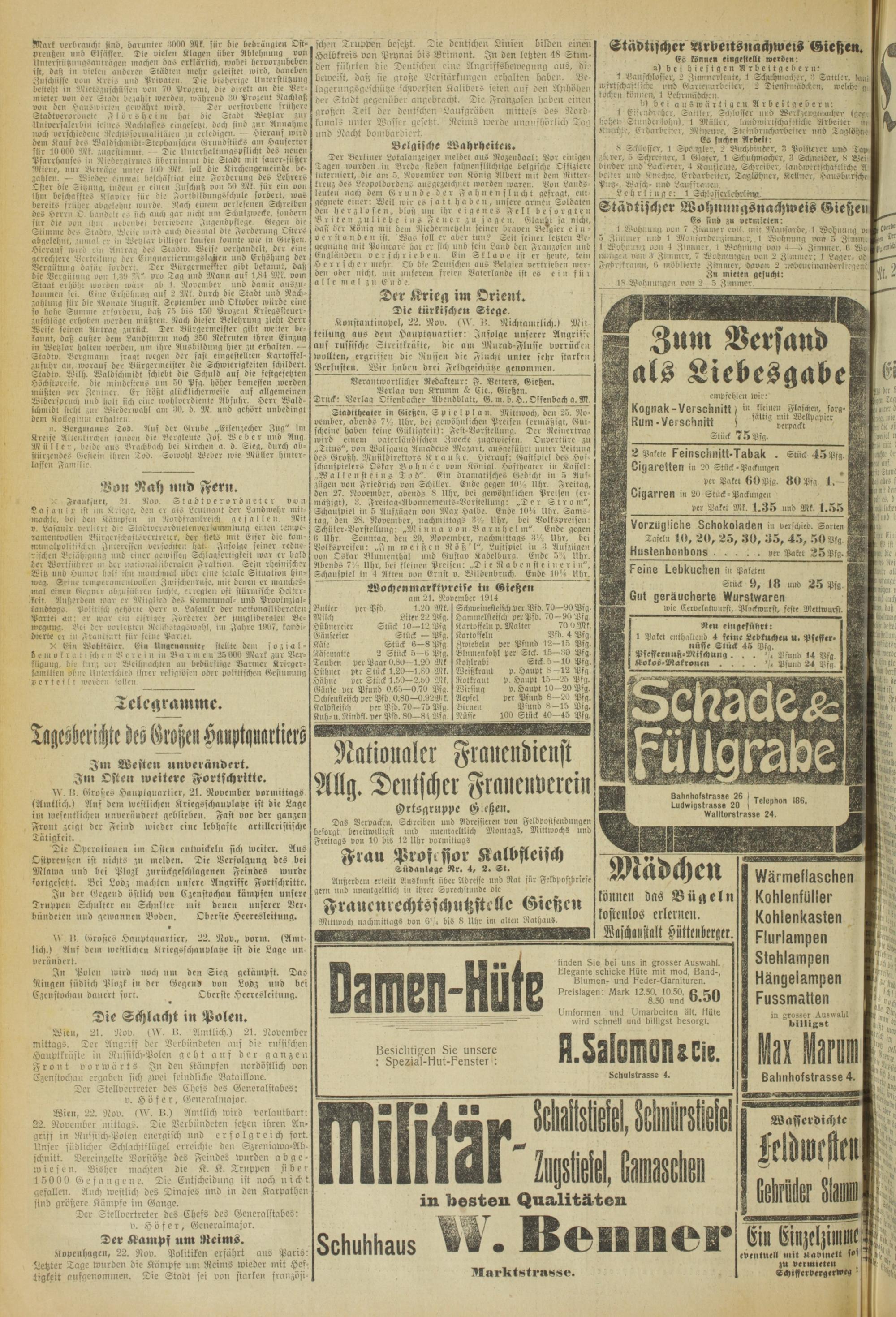 IV. I!. Großes Hauptquartier, 22. Nov., vorm. (Amt- lich.) Ans dem westlichen Kriegsschauplätze ist die Lage un verändert.