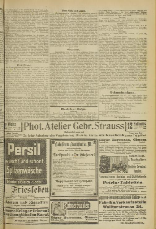 Berstorbene. Frau Wifhednibn« Tiehl, geb. Fink, iit Aschar bei Wetzlar, 40 Fahre alt.— Frau !I eodvre Roth, geb. ftogi. in Mießcn. 77 Fahre alt, — Heinrich Sielten V., Mente »ds<hbn>« nohincr in Mroßen-Oinbvn. 01 Fohre alt.