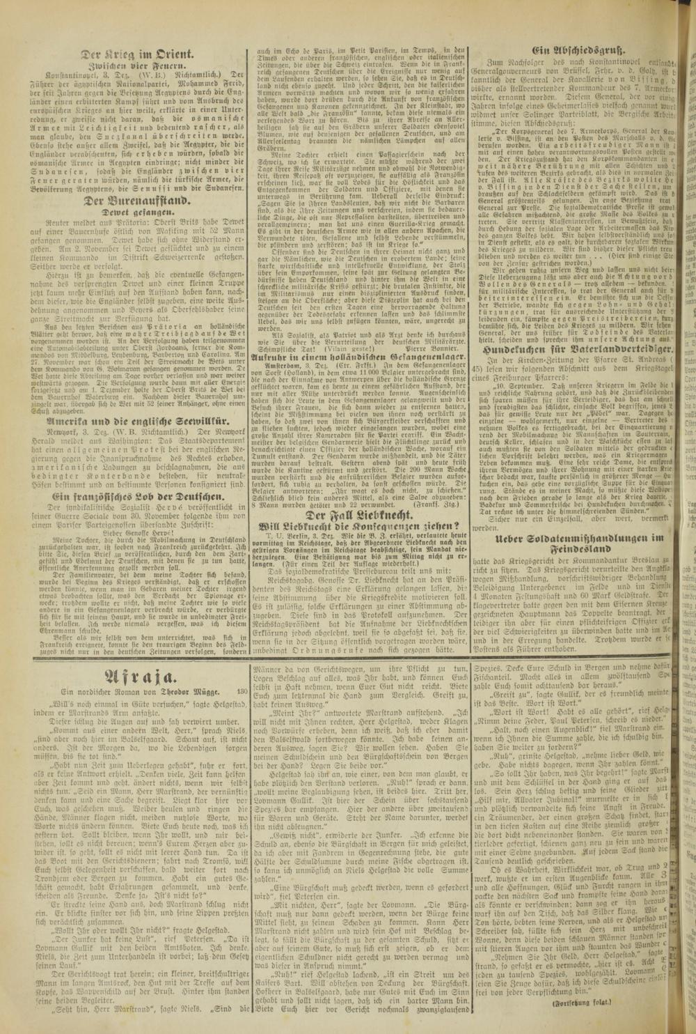 Reuter meldet aus Prätoria: Oberst Brits habe Dewet auf einer Baucrnhuse östlich von Mafiking mit 52 Mann gefangen genommen. Dewet habe sich ohne Widerstand ergeben. Am 2. November sei Dewet geflüchtet und zu einem kleinen Kommando im Distrikt Schweizerrcnke gestoßen. Seither werde er verfolgt.