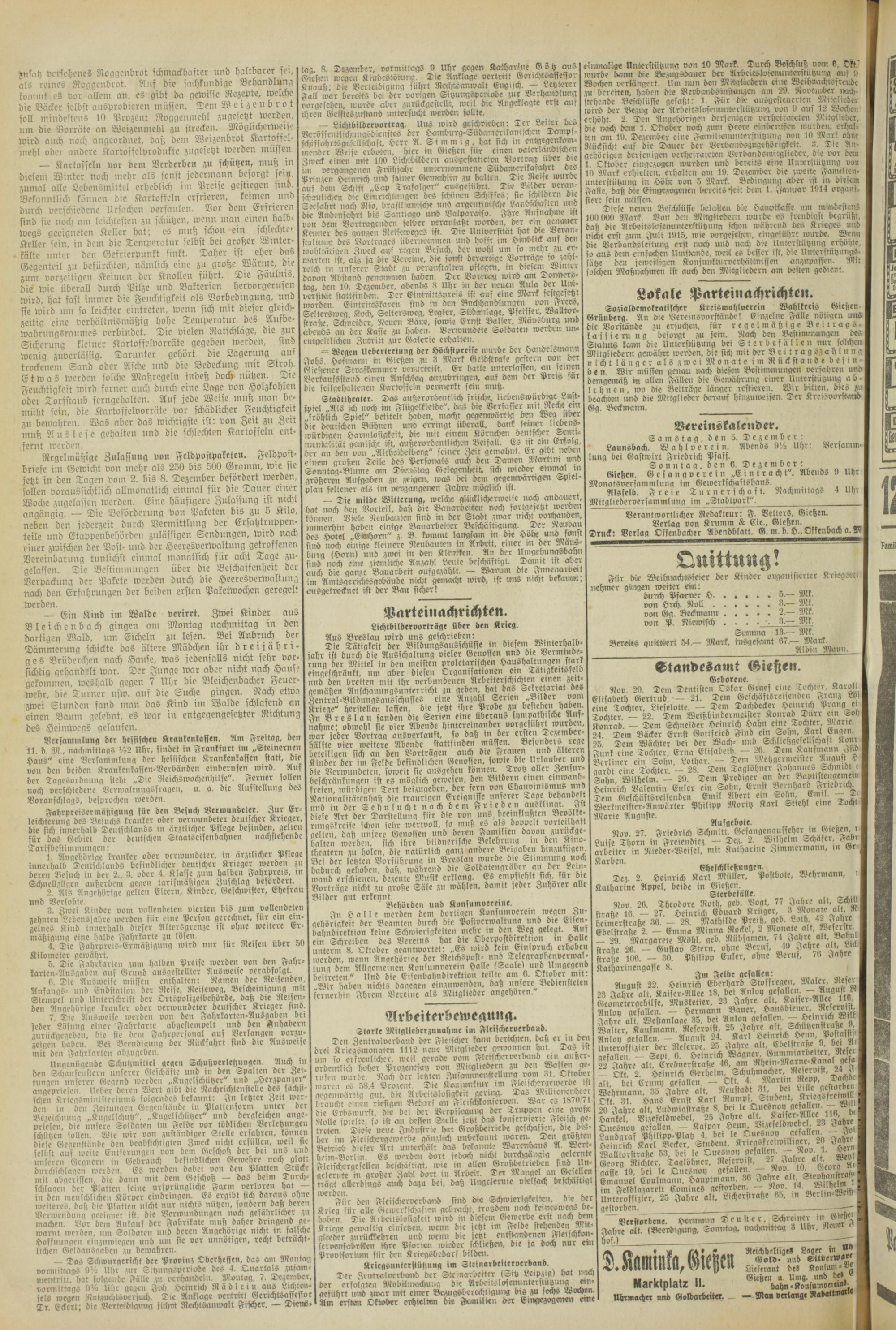 Dez. 2. Heinrich Karl Müller. Postbote, Wehrmann, , atharine Appel, beide in Gießen.