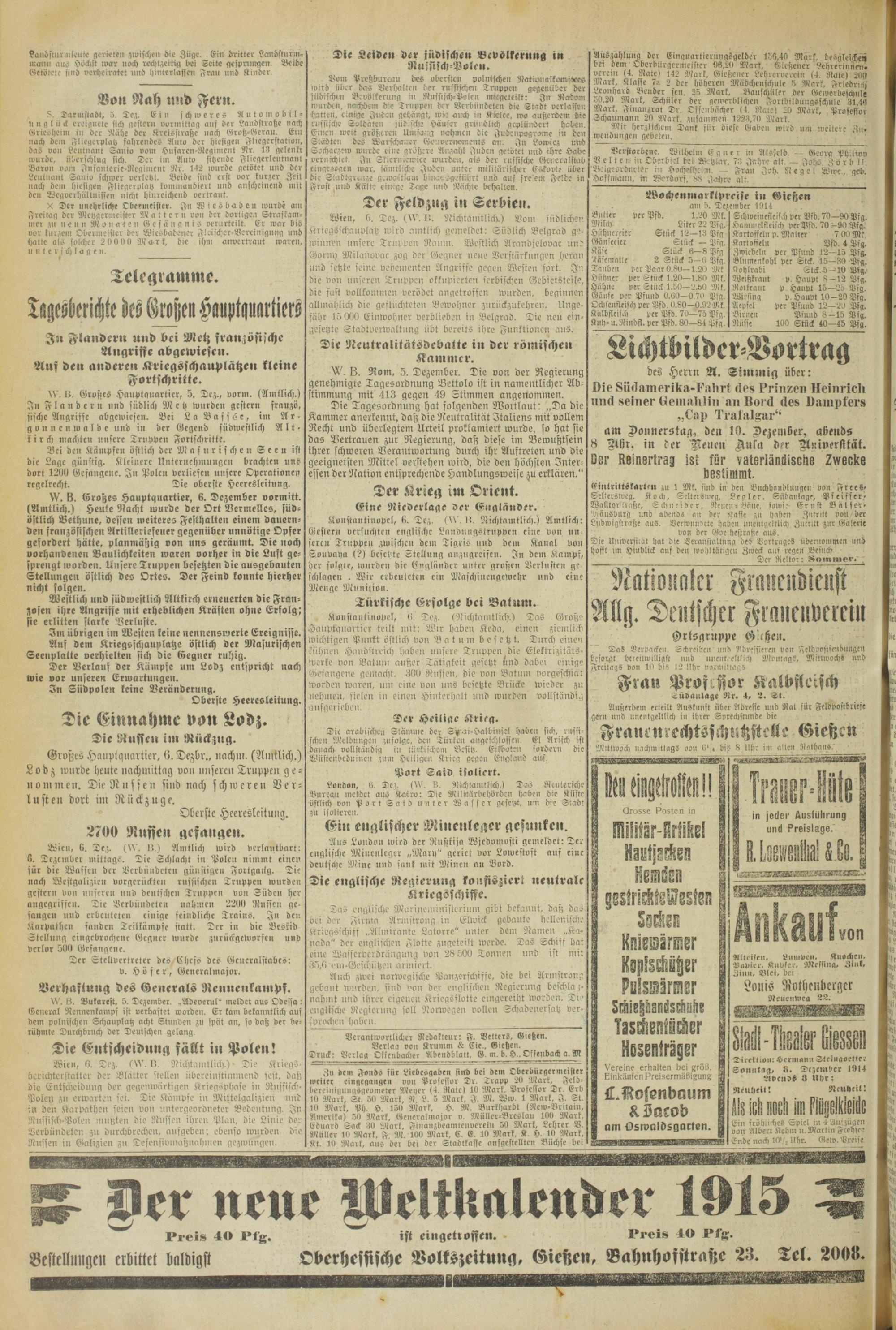 Großes Hauptquartier, 6. Dezbr., »achi». (Amtlich.) Lodz ivurde heute nachmittag von unsere» Truppen genommen. Die Nüssen sind nach schweren Verlusten dort im Rückzüge.