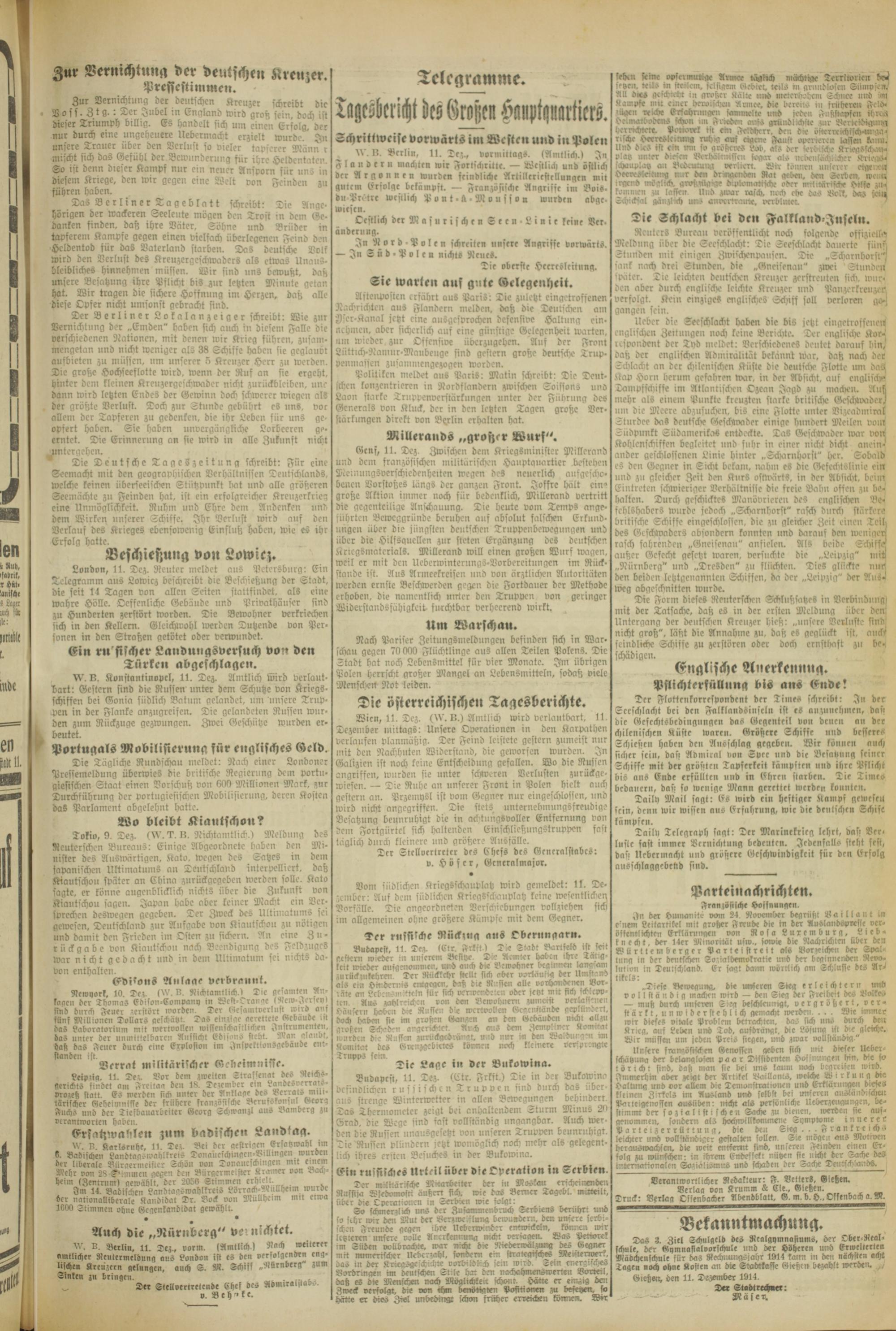 Zur Vernichtung der deutschen Kreuzer schreibt die Voss. Ztg.: Ter Jubel in England wird groß sein doch ist dieser Triumph billig. Es handelt sich um einen Erfolg der nur durch eine ungeheuere Uebcrmackt erzielt wurde. In unsere Trauer über den Verlust so vieler tapferer Männ c mischt sich das Gefühl der Bewunderung für ihre Heldentaten So ist denn dieser Kampf nur ein neuer Ansporn für uns in diesem Kriege, den wir gegen eine Welt von Feinden zu führen haben.