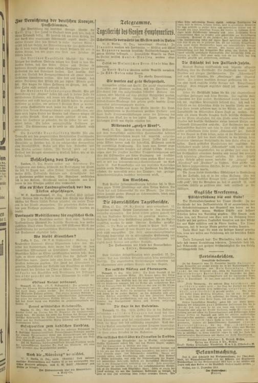 IV. B. Berlin, 11. Dez., vormittags. (Amtlich.) In Flandern machten wir Fortschritte. — Westlich und östlich der Argonnen wurden feindliche Artilleriestellungen mit gutem Erfolge bekämpft. — Französische Angriffe im Bois, du Prltre westlich Pont-st-Moussoa wurden abge- wiesen.