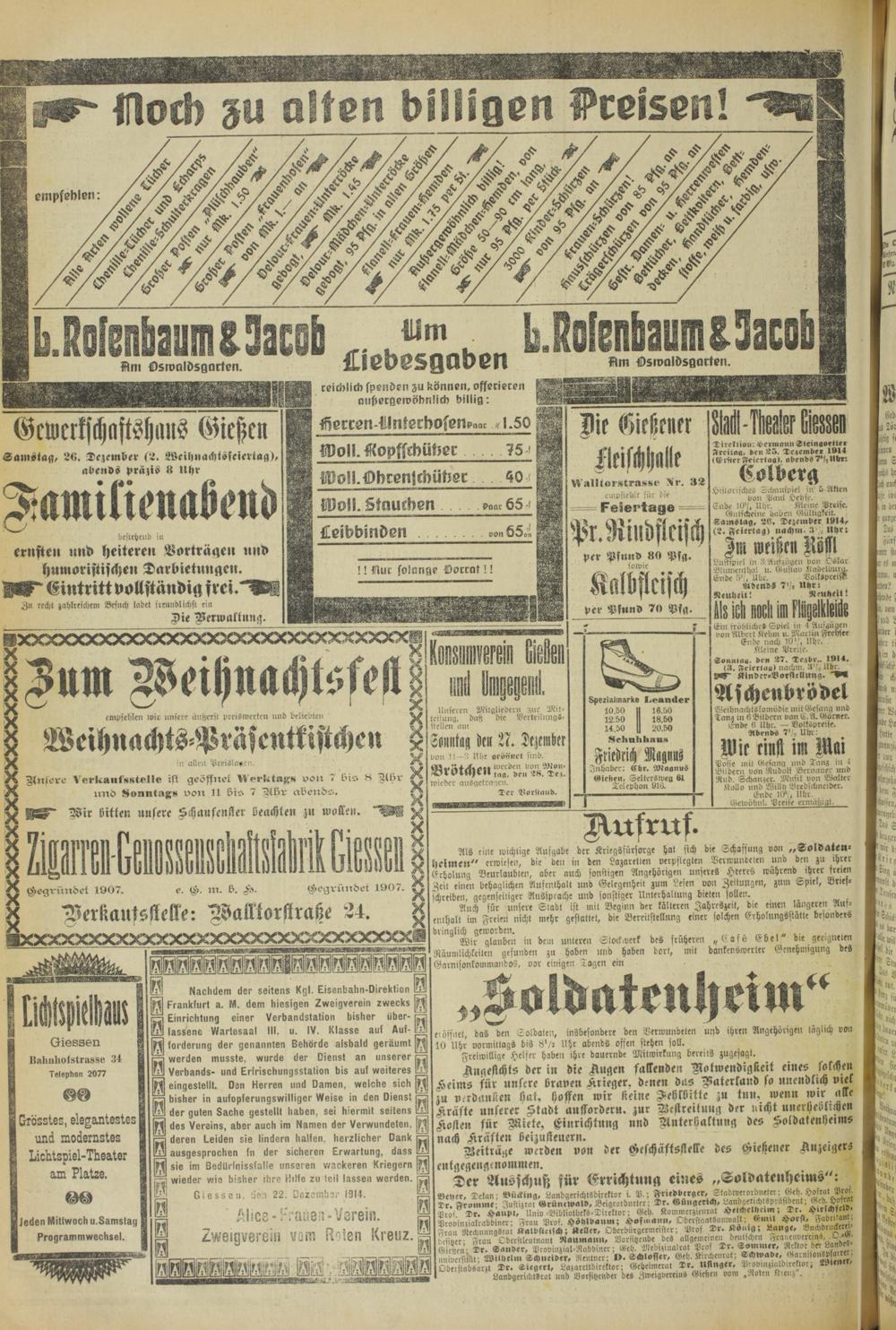Nachdem der seitens Kgl. Eisenbahn-Direktion Frankfurt a. M. dem hiesigen Zweigverein zwecks Einrichtung einer Verbandstation bisher überlassene Wartesaal III. u. IV. Klasse auf Aufforderung der genannten Behörde alsbald geräumt werden musste, wurde der Dienst an unserer Verbands- und Eririschungsstation bis auf weiteres eingestellt. Dan Herren und Damen, welche sich bisher in aufopferungswilliger Weise in den Dienst der guten Sache gestellt haben, sei hiermit seitens des Vereins, aber auch im Namen der Verwundeten, deren Leiden sie lindern halfen, herzlicher Dank ausgesprochen fn der sicheren Erwartung, dass sie im Bedürfnissfalle unseren wackeren Kriegern wieder wie bisher ihre Hilfe zu teil lassen werden. Giessen, den 22. Dezember 1914.