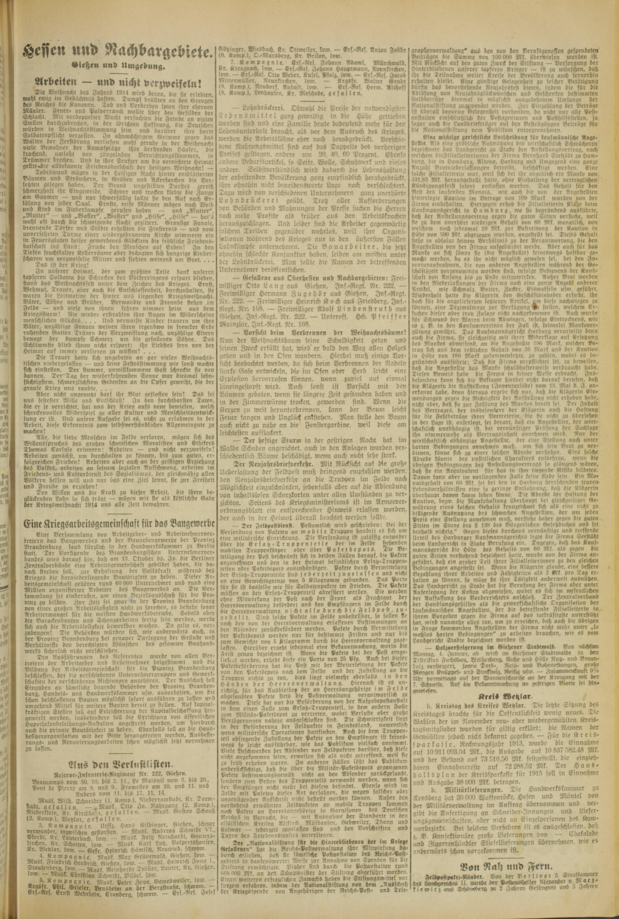 Ten Willen und die Kraft zu dieser Arbeit, die ihren be» glückenden Lohn in sich trägt — mögen wir sic als köstlichste Gabe der SrlcgSwcihnacht 1814 uns alle Zeit bewahren.