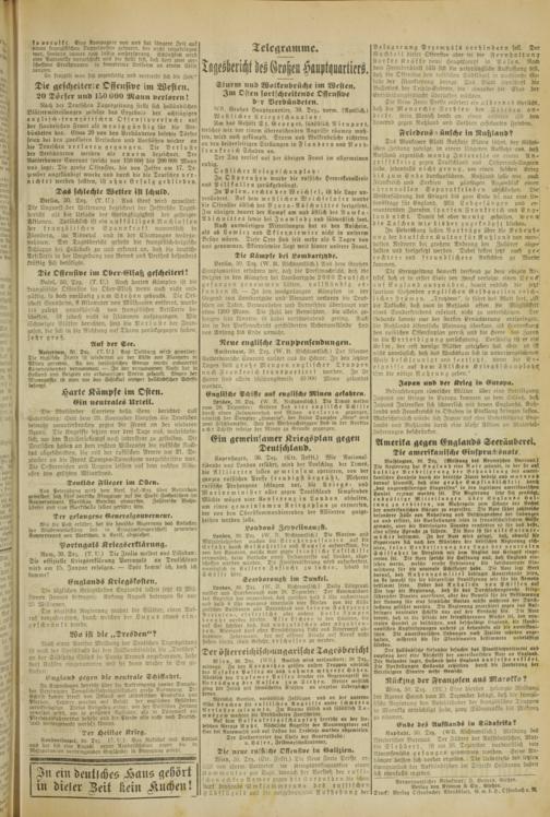 Berlin, 30. Tez. (XV. II. Nichtamtlich.) Aus dem Grohen Hauptquartier erfahren wir, daß die Pressenachricht, daß die Belgier in den Kämpfen bei Lombartzyde 2000 Deutsche gefangen genommen hätten, vollständig erfunden ist. — In den wochenlangcn Kämpfen in der Gegend von Lombartzyde und Nieuport verloren die Deutschen an Toten. Verwundeten und Vermißten überhaupt nur etwa 1200 Mann. Tie Zahl der Vermißten, die allein gefangen sein könnten, ist dabei verschwindend gering. Auch die in der Presscnachricht geschilderten Ncbenumständc sind von Ansang bis Ende unwahr.
