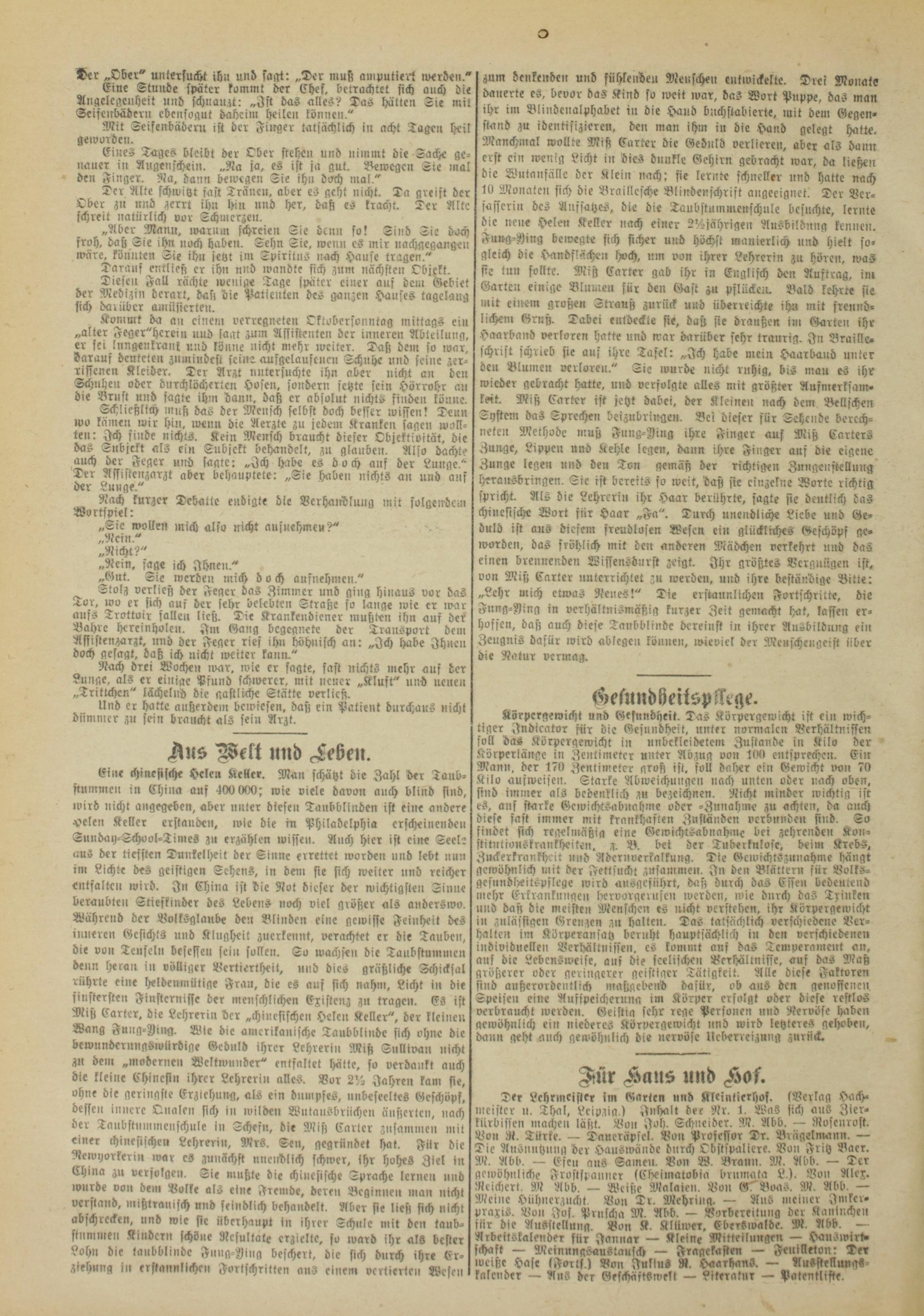 Eine chinesische Helen Keller. Man schützt die Zahl der Taubstummen in China aus 400 000; wie viele davon auch blind sind, ivird nicht angegeben, aber unter diesen Tanbblinden ist eine andere »eleu Keller erstanden, wie die tn Philadelphia erscheinende» Sunday-School-Timcs z» erzählen wissen. Auch hier ist eine Seele aus der tiefsten Dunkclheit der Sinne errettet worden und lebt nun im Lichte des geistigen Sehens, in de», sie sich weiter »nd reicher entfalten wird. In China ist die Not dieser der wichtigsten Sinne beraubten Stiejkinder des Lebens noch viel größer als anderswo. Während der BolkSglanb« den Blinden eine gewisse Feinheit des inneren Gesichts und Klugheit zucrkennt, verachtet er die Taube», die von Teufeln besessen sei» sollen. So wachs«» die Taubstumme» denn heran in völliger Vertiertheit, nnd dies gräßliche Schicksal rührte eine heldenmütige Frau, die es aus sich nahm, Licht in die finstersten Finsternisse der menschlichen Existenz zu tragen. Es ist Miß Carter, die Lehrerin der „chinesischen Heien Keller", der kleinen Wang Fung-Jing. Wie die amerikanische Taubblinde sich ohne die bewunderungswürdige Geduld ihrer Lehrerin Miß Snllivan nicht z« dem „modernen Weltwunder" entfaltet hätte, so verdankt auch die kleine Chinesin ihrer Lehrerin alles. Vor 24i Jahre» kam sie, ohne die geringste Erziehung, als ein dumpfes, unbeseeltes Geschöps, dessen innere Onale» sich in wilde» Wutausbrüchen äußerten, nach der Tanbstnmmenschule in Schefu, die Miß Carlcr zusammen mit einer chinesischen Lehrerin, Mrs. Se», gegründet hat. Für die Ncivyorkerin ivar cs zunächst uncichlich schwer, Ihr hohes Ziel in China zu verfolge». Tie mußte die chinesische Sprache lerne» und wurde von de», Volke als eine Fremde, deren Beginnen man nicht verstand, mißlranisch und feindlich behandelt. Aber sie ließ sich nicht abschrcckcn, und wie sic überhaupt in ihrer Schule mit de» taub- stamme» Kindern schöne Resultat« erzielte, so ward ihr als bester Lohn die taubblindc Fnng-Iing beschert, die sich durch ihre Erziehung in erstannlichen Fortschritten aus einem vertierten Wesen