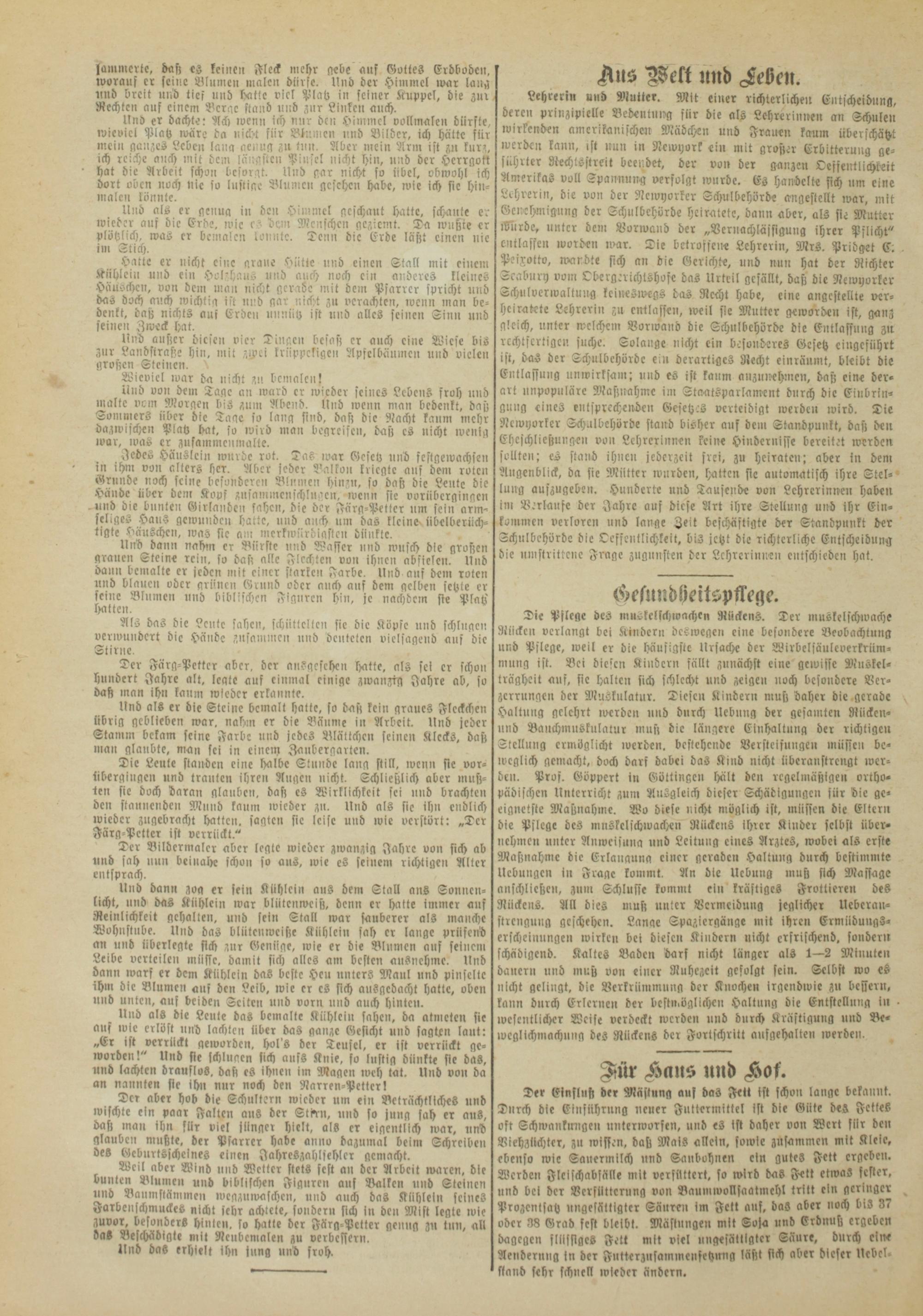 Tie Leute standen eine halbe Slundc lang still, wenn sie vur- iiberginge» und trauten ihre» Augen nicht. Schließlich aber muß- ien sie doch daran glauben, baß es Wirklichkeit sei und brachten den staunende» Mund kaum wieder zn. Und als sie ihn endlich wieder zugebracht hatten, sagte» sie leise und wie verstört: „Ter Färg-Petter ist verrückt."