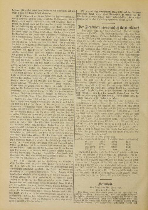 DaS Jahr 1911 war ein Schreckschuß für die deutsch- nationalen Politiker. Die Geburlenrate hatte ihre min schon icit Jahren sinkende Tendenz beibehaltcn; gleichzeitig wap aber der Rückgang der Sterbcrate, der bis dahin jenen Rückgang der Geburten mehr oder weniger aufgehoben hatte, znm Stillstand gckonimen, sodaß der Geburtenüberschuß mit einem Male einen gewaltigen Absturz erfuhr. Er sank von 873113 Personen oder 13,62 pro 1000 der Bevölkerung auf 739 945 oder 11,32 pro 1000 der Bevölkerung. Damit rückte für gewisse Leute das drohende Gespenst eines Bevölkcrungs- jtillstanües und schließlich Rückganges in greifbare Nähe. Unzählige Federn wurden in Bewegung gesetzt, um die Ur- jack>e des Hebels zu ergriinden und in buntscheckiger Mannich- saltigkeit reihte sich Vorschlag an Vorschlag, wie man am besten dem Nebel Einhalt tun könnte. Aber noch ehe irgend einer von diesen Vorschlägen praktische Gestalt angenommen hatte, haben sich^die Verhältnisse ganz von selbst gebessert. Was schon ans den Veröffentlichungen einiger Einzelstaaten über die Bevölkerungsvermchrung de? Jahres 1912 hcrvo» ging, das wird jetzt durch die in dem soeben herausge- kommcnen Vicrteljahrsheft zur Statistik des Deutschen Reiches mitgeteilten Ziffern für das ganze Reich bestätigt: Daß nämlich das Jahr 1911 infolge seines die Sänglings- stcrlilichkcit begünstigenden heißen Sommers ein Ausnahme. >ahr darslclllc und daß die normale Entwicklung der Bevölkerungsbewegung bis jetzt absolut keinen Anlaß gibt, besonders schwarz in die Zukunft zu sehen.