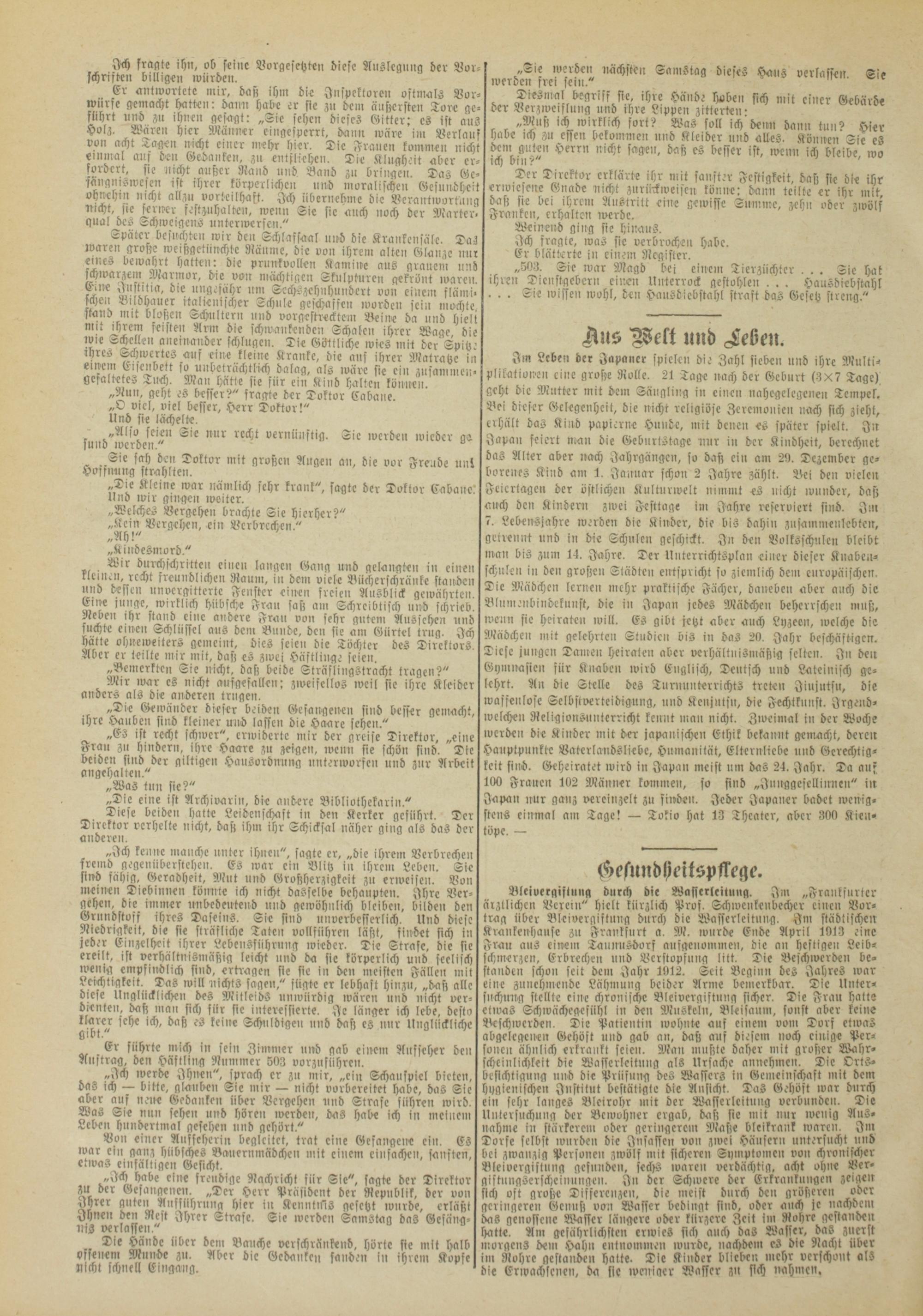 Er antwortete mir, da» ihm die Inspektoren oftmals Vorwürfe gemacht hatten: dann habe er sie zu dem äußersten Tore geführt und zu ihnen gesagt: „Sic sehen dieses Gitter; cs ist aus Holz. Wären hier Männer eingespcrrt, daun wäre im Verlauf von acht Tagen nicht einer mehr hier. Die Frauen komme» nicht einmal ans den Gedanken, zu entfliehen. Die Klugheit aber erfordert, sie nicht außer Rand und. Band zu bringen. Das Gc- fängniswesen ist ihrer körperlichen und moralischen Gesundheit ohnehin nicht allzu vorteilhaft. Ich übernehme die Verantwortung nicht, sie ferner festzuhalten, wenn Sic sic auch noch der Marter, gual des Schweigens unterwerseu."