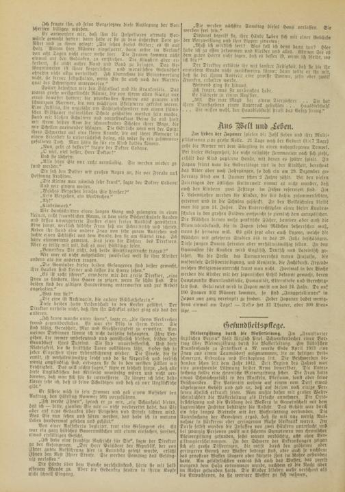 Im Leben der Japaner spielen die Zahl sieben und ihre Multiplikationen eine große Rolle. 21 Tage nach der Geburt (3X7 Tage) geht die Mutter mit dem Säugling in einen nahegclcgenen Tempel. Bei dieser Gelegenheit, die nicht religiöse Zeremonien nach sich zieht, erhält das Kind papicrne Hunde, mit denen es später spielt. In Japan feiert man die Geburtstage nur in der Kindheit, berechnet bas Alter aber nach Jahrgängen, so daß ein am 2t). Dezember geborenes Kind am 1. Januar schon 2 Jahre zählt. Bei den vielen Feiertagen der östlichen Kulturwelt nimmt eS nicht wunder, daß auch den Kindern zwei Festtage im Jahre reserviert sind. Im 7. Lebensjahre werden die Kinder, die bis dahin znsammeulcbtcn, getrennt und in die Schulen geschickt. In den Volksschulen bleibt man bis zum 11. Jahre. Ter Nnterrichtsplan einer dieser Knabenschulen in den großen Städten entspricht so ziemlich dem europäischen. Die Mädchen lernen mehr praktische Fächer, daneben aber auch die Blum.'nbindekunst, die in Japan jedes Mädchen beherrsche» muß, wenn sic heiraten ivill. Es gibt jetzt aber auch Lyzeen, ivclche die Mädchen mit gelehrten Studien bis i» das 20. Jahr beschäftigen. Diese jungen Damen heiraten aber verhältnismäßig selten. In den Gymnasien für Knaben wird Englisch, Deutsch und Lateinisch gelehrt. Au die Stelle des Turnunterrichts treten Jiujutsu, die waffenlose Selbstverteidigung, und Kcnjuts», die Fechikutist. Jrgend- ivelcheu Religionsunterricht kennt man nicht. Zweinial in der Woche werden die Kinder mit der japanischen Ethik bekannt gemacht, deren Hauptpunkte Vaterlandsliebe, Humanität, Elternliebe und Gerechtigkeit sind. Geheiratet wird in Japan meist um das 21. Jahr. Da auf 100 Frauen 102 Männer kommen, so sitib »Junggesellimien" in Japan nur ganz vereinzelt zu finden. Jeder Japaner badet wenigstens einmal am Tage! — Tokio hat 13 Theater, aber 300 Sie»* töpe. —
