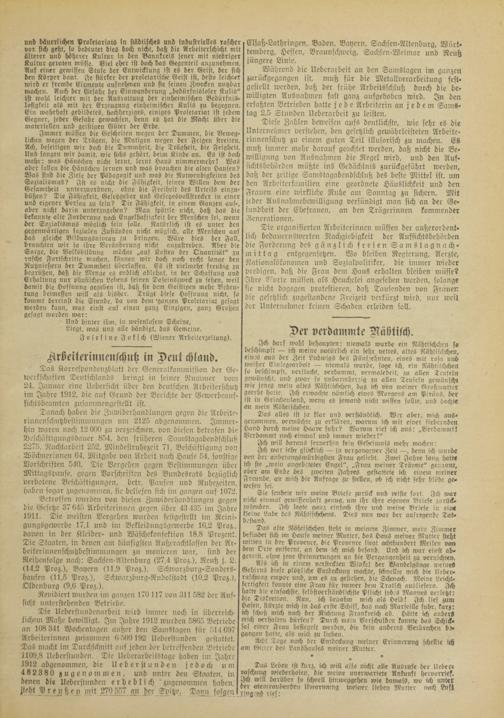 Die organisierten Arbeiterinnen müssen der außerordentlich bedauernswerten Nachgiebigkeit der Aufsichtsbehörden die Forderung des gänzlich freien Samstagnachmittag entgegensetzen. Wo bleiben Regierung, Aerzte, Nationalökononien und Sozialpolitiker, die immer wieder predigen, daß die Frau dem Haus erhalten bleiben müsse? Ihre Worte müssen als Heuchelei angesehen werden, solange sie nicht dagegen protestieren, daß Tausenden von Frauen die gesetzlich zugestandene Freizeit verkürzt wird, nur weit der Unternehmer keinen Schaden erleiden soll.