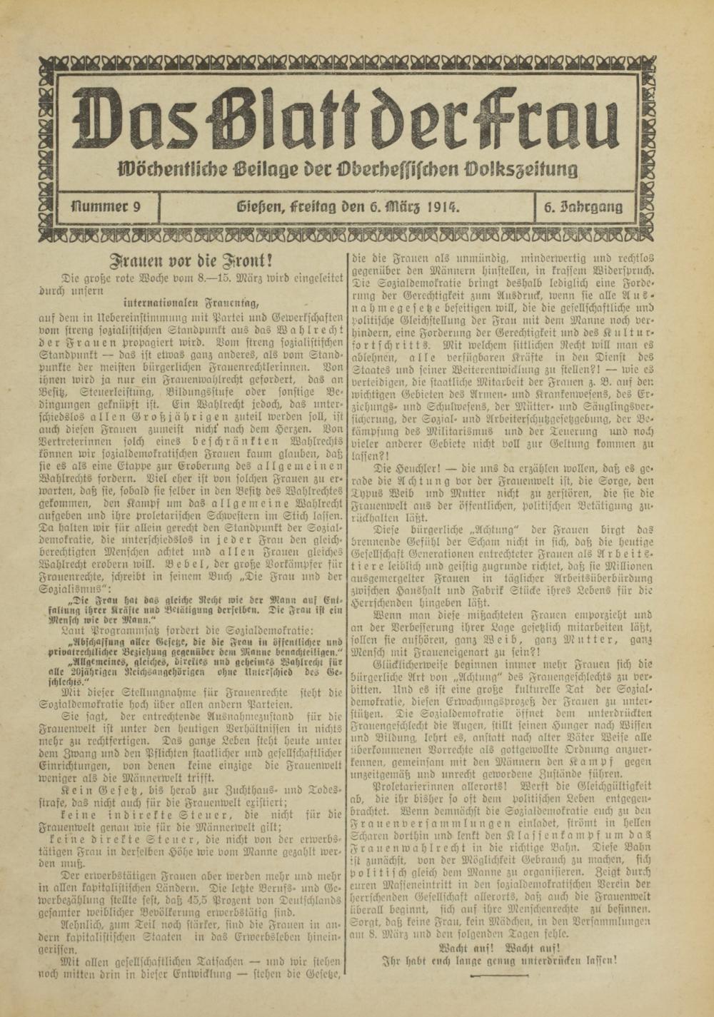 Prolctarierinnen allerorts! Werst die Gleichgültigkeit ab, die ihr bisher so oft dem politischen Leben entgegen- brachtct. Wenn demnächst die Sozialdemokratie euch zu den F r a u e n v e r s a m m l u n g e n einladet, strömt in hellen Scharen dorthin und lenkt den K l a s s e n k a m p f u m das F r a u e n w a h l r c ch t in die richtige Bahn. Diese Bahn ist zunächst, von der Möglichkeit Gebrauch zu machen, sich politisch gleich dem Manne zu organisieren. Zeigt durch euren Masseneintritt in den sozialdemokratischen Verein der herrschenden Gesellschaft allerorts, daß auch die Frauenwelt überall beginnt, sich auf ihre Menschenrechte zu besinnen. Sorgt, daß keine Frau, kein Mädchen, in den Versammlungen am 8. März und den folgenden Tagen fehle.