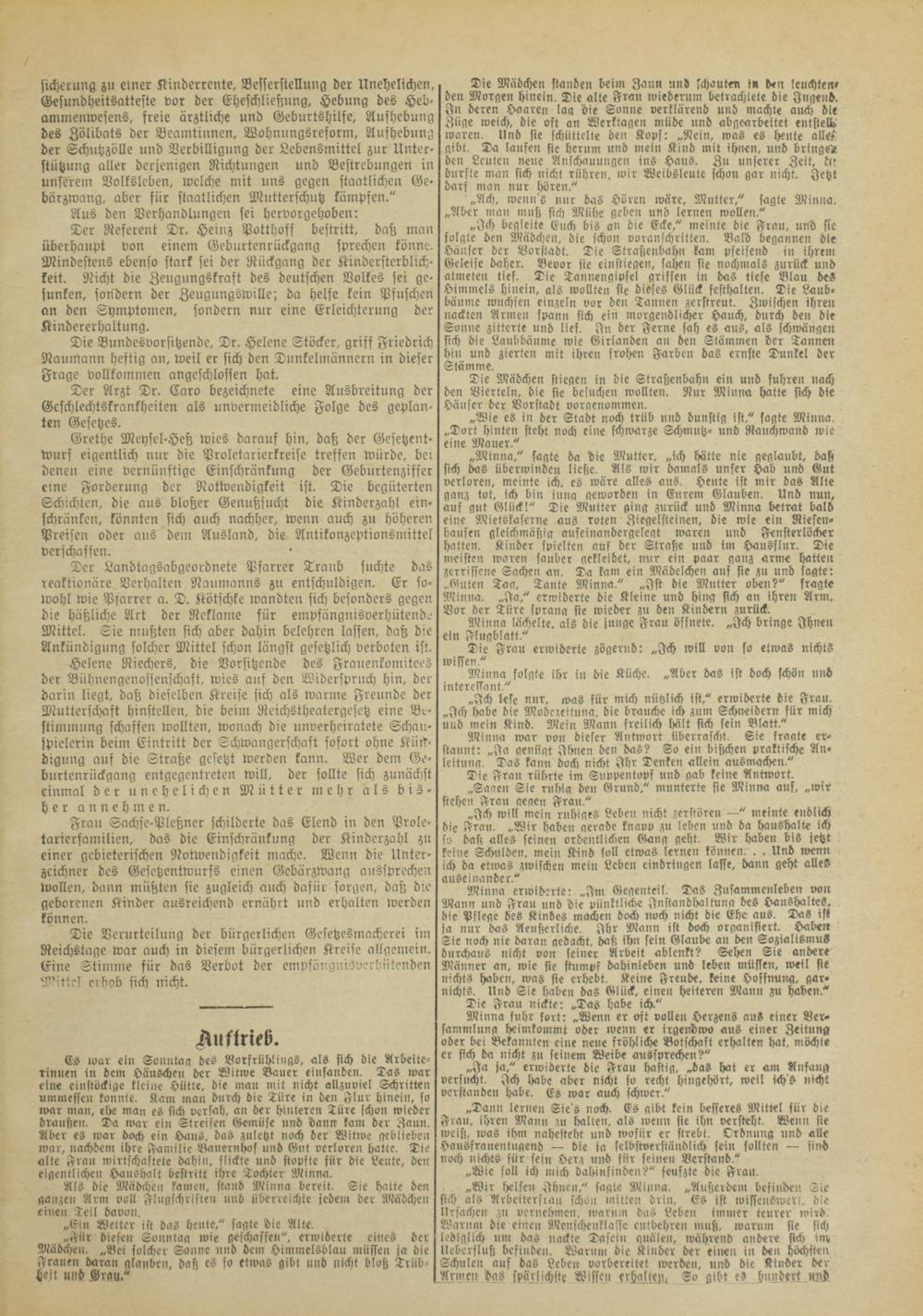 sicherung zu einer Kinderrente, Besserstellung der Unehelichen, Gesundheitsatteste vor der Eheschließung, Hebung des Heb- ammenwesens, freie ärztliche und Geburtshilfe, Aufhebung des Zölibats der Beamtinnen, Wohnungsreform, Aufhebung der Schutzzölle und Verbilligung der Lebensmittel zur Unterstützung aller derjenigen Richtungen und Bestrebungen in unserem Volksleben, welche mit uns gegen staatlichen Gebärzwang, aber für staatlichen Mutterschutz kämpfen."