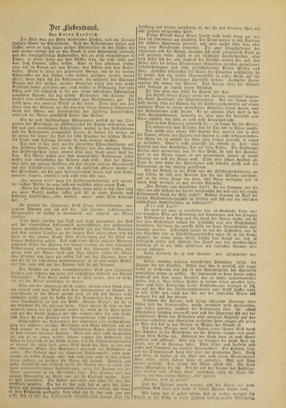 Das müsse aber etwas sölli Guctes sein, ivenn's von so weit her komme, meinte der Salomo und beutete in nicht mißzuversteheu- der Weise an, es gelüste ihn schon lang einmal darnach, so etwas zu versuchen, Wcnn's nicht anberscht sei, bestell« er halt eine Portion von dem chinesischen Tee ans seine Kosten. Die Fclbberger Wirtin aber antwortete, das sei ihre Sache, sie lade den Salomo, weil er der Marei immer so gut vorauswate, hiemtt zu einem Vieritee ein und die Marci auch. Diese aber lehnte dankenb ab. Tenn sie war mehr für Spirituosen und bestellte gleich »och ei» Gebranntes zn den bereits aenossencn.