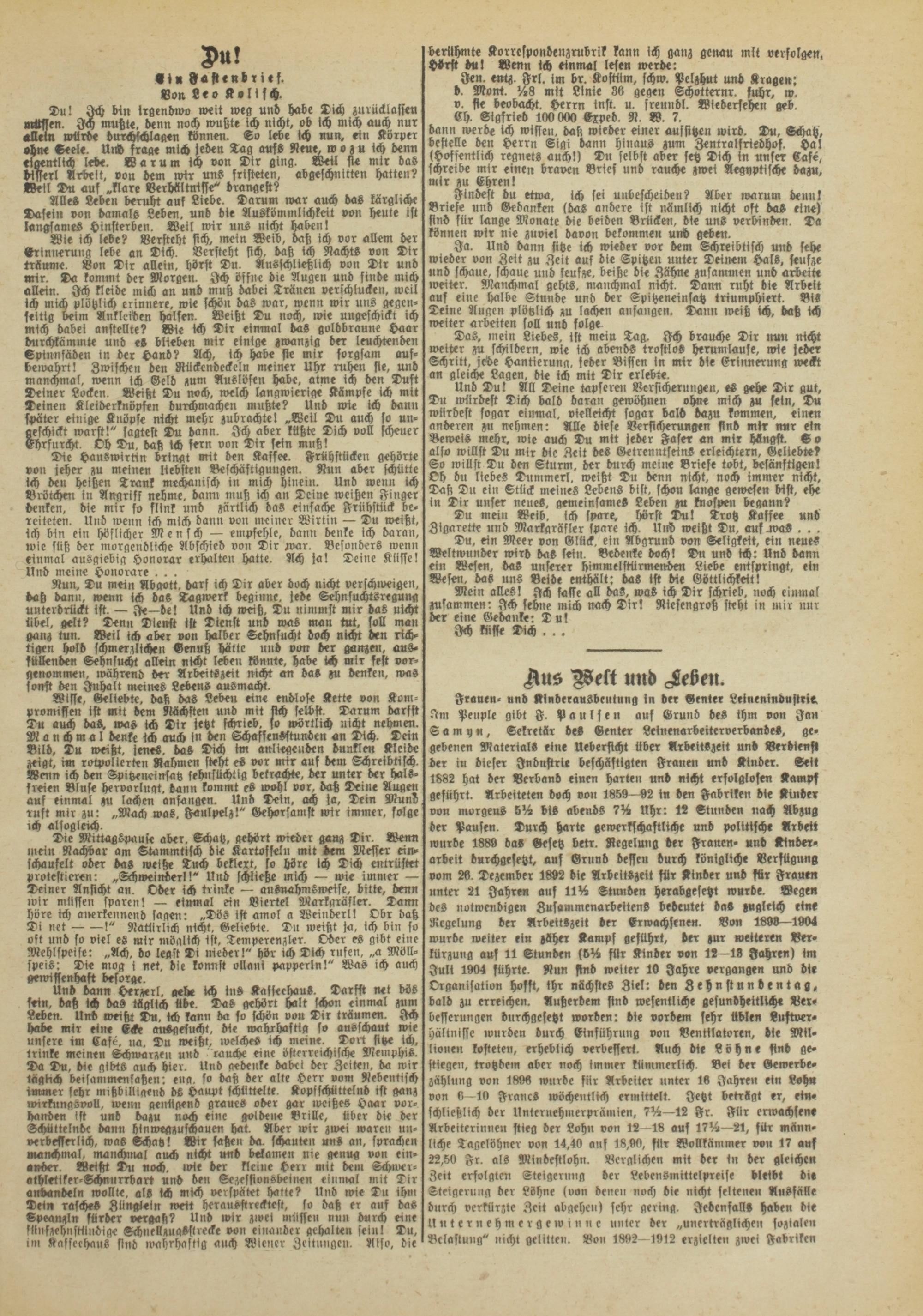 Du! Ich bin irgendwo weil weg und habe Dich zurücklasseu müssen. Ich mutzt«, denn noch wutzt« ich nicht, ob ich mich auch nur «llein würde durchschlagen können. To lebe ich nun. ein Körper ohne Seele. Und frag« mich jeden Dag aus« Reue, w o z u ich denn «iaenilich leb«. Warum ich von Dir ging. Weil fl« mir das bisserl Arbeit, von dem wir uns fristeten, abgeschnitten hatten? «eil Du auf .klare Verhältnisse" drängest?