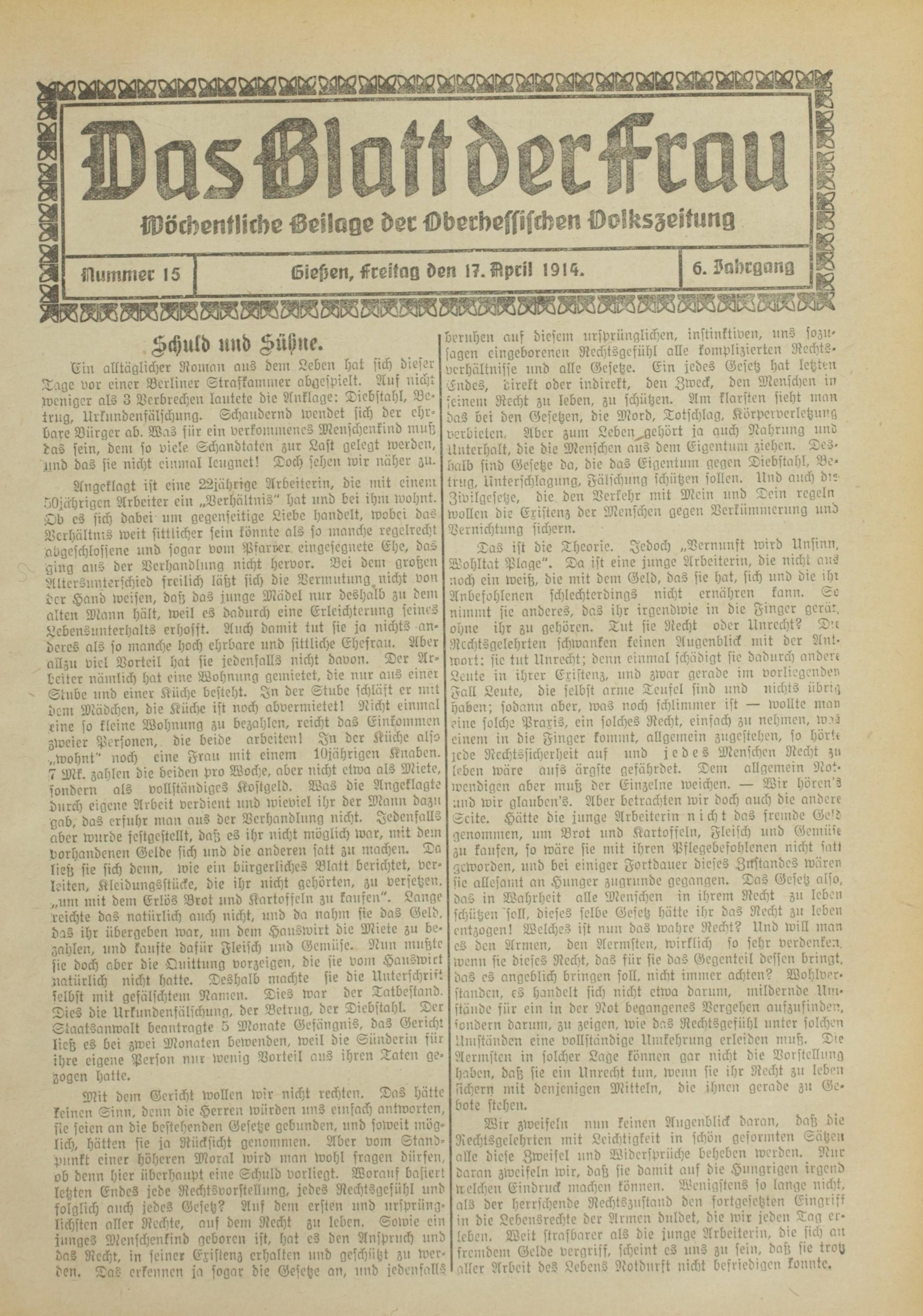 Cur alltäglicher Roman aus dem Leben hat sich dieser Tage vor einer Berliner Straskammer abgespielt. Auf nicht weniger als 3 Verbrechen lautete die Anklage: Diebstahl, Betrug, Urkundenfälschung. Schaudernd wendet sich der ehrbare Bürger ab. Was für ein verkommenes Menschenkind muß das sein, dem so viele Schandtaten zur Last gelegt werden, und das sie nicht einmal leugnet! Doch sehen wir näher zu.