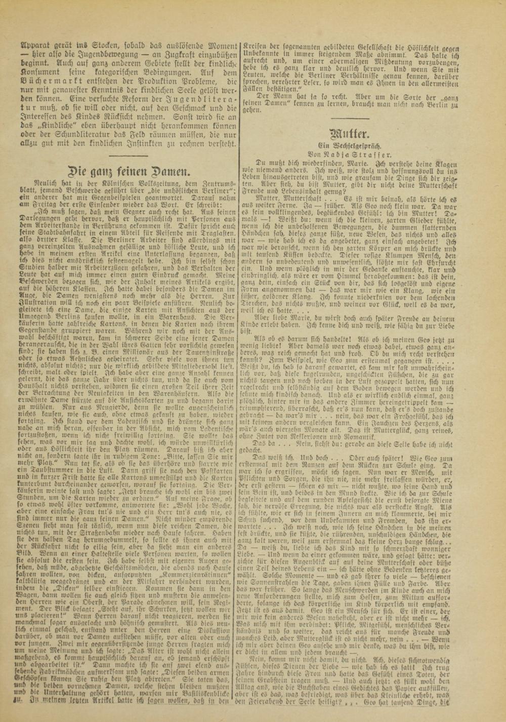 Apparat gerät ins Stocken, sobald Las auslösende Moment — hier also die Jugendbewegung — an Zugkraft einzubützen beginnt. Auch aus ganz anderem Gebiete stellt der kindliche Konsument seine kategorischen Bedingungen. Auf dem Büchermarkt entstehen der Produktion Probleme, die nur mit genauester Kenntnis der kindlichen Seele gelöst wer- den könnem Eine versuchte Reform der Jugendliteratur muß, ob sie will oder nicht, auf den Geschmack und die Interessen des Kindes Rücksicht nehmen. Sonst tvird sie an das „Kindliche" eben überhaupt nicht herankommen können oder der Schundliteratur das Feld räumen müssen, die nur allzu gut mit den kindlichen Instinkten zu rechnen versteht.