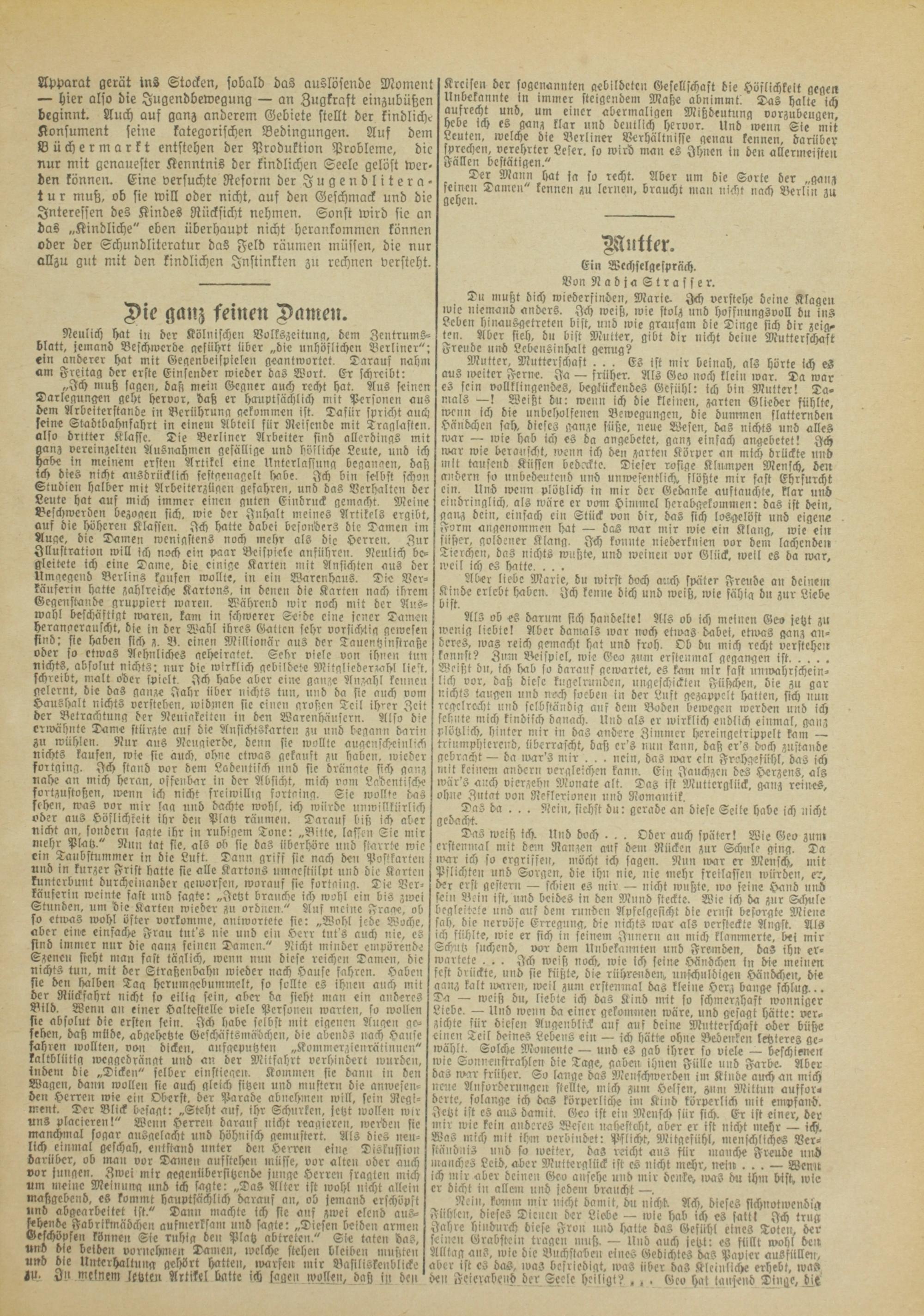 Neulich hat in der Kölnischen Bolkszeituna, dem Zentrums- blatt, jemand Beschwerde aeslihrt über „die unhöflichen Berliner": ein anderer hat mit Geaenbeispicle» geantwortet. Darauf nahm am Freitag der erste Einsender wieder das Wort. Er schreibt: