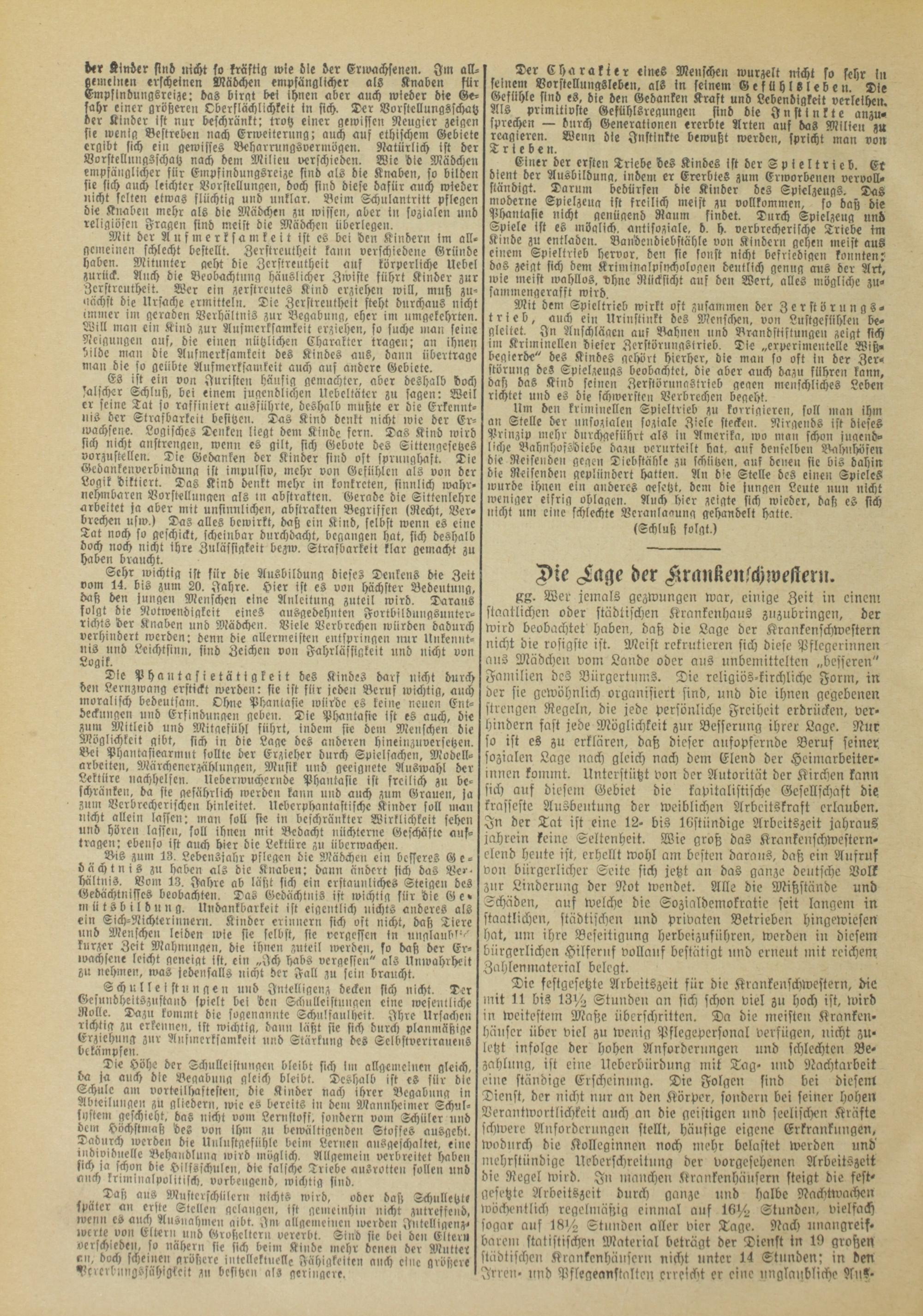 Sehr wichtig ist für die Ausbildung dieses Denkens die Zeit vom 14. bis zum 20. Fahre. Hier ist cs von hächster Bedeutung, daß den jungen Menschen ein« Anleitung zuteil wirb. Daraus folgt die Notwendigkeit eines ausgedehnten Fortbildungsunterrichts der Knaben und Mädchen. Viele Verbrechen würden dadurch verhindert werden: denn die allermeisten entspringen nur Unkenntnis und Leichtsinn, find Zeichen von Fahrlässigkeit und nicht von Logik.