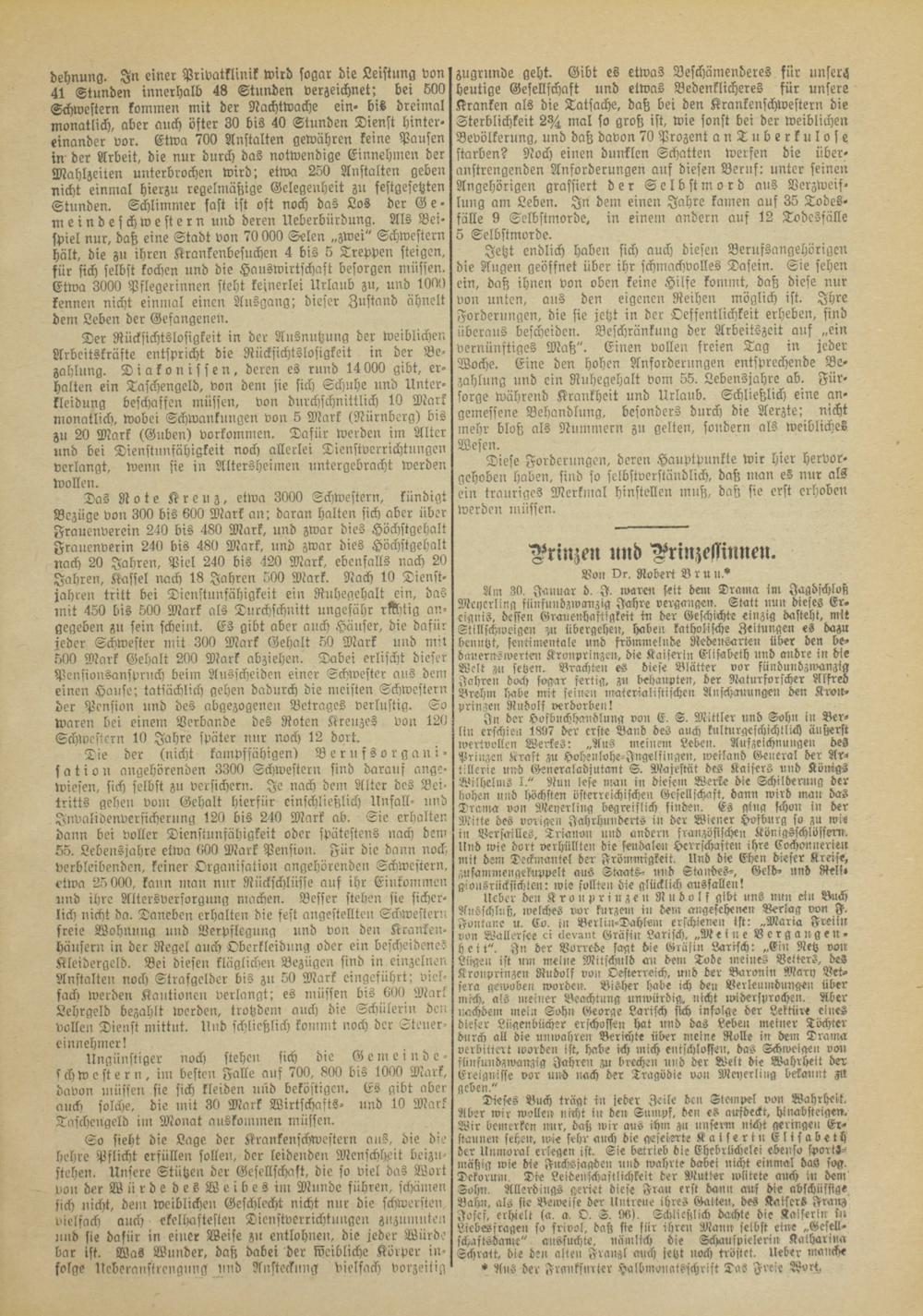 Schwestern kommen mit der Nachtwache ein- bis dreimal monatlich, aber auch öfter 30 bis 40 Stunden Dienst hintereinander vor. Etwa 700 Anstalten gewähren keine Pausen in der Arbeit, die nur durch das notwendige Einnehmen der Mahlzeiten unterbrochen wird; etwa 250 Anstalten geben nicht einmal hierzu regelmähige Gelegenheit zu festgesetzten Stunden. Schlimmer fast ist oft noch das Los der Gemeindeschwestern und deren Ueberbürdung. Als Beispiel nur, daß eine Stadt von 70 000 Selen „zwei" Schwestern hält, die zu ihren Krankenbesuchen 4 bis 6 Treppen steigen, für sich selbst kochen und die Hauswirtschaft besorgen müssen. Etwa 3000 Pflegerinnen steht keinerlei Urlaub zu, und 1000 kennen nicht einmal einen Ansgang: dieser Zustand ähnelt dem Leben der Gefangenen.