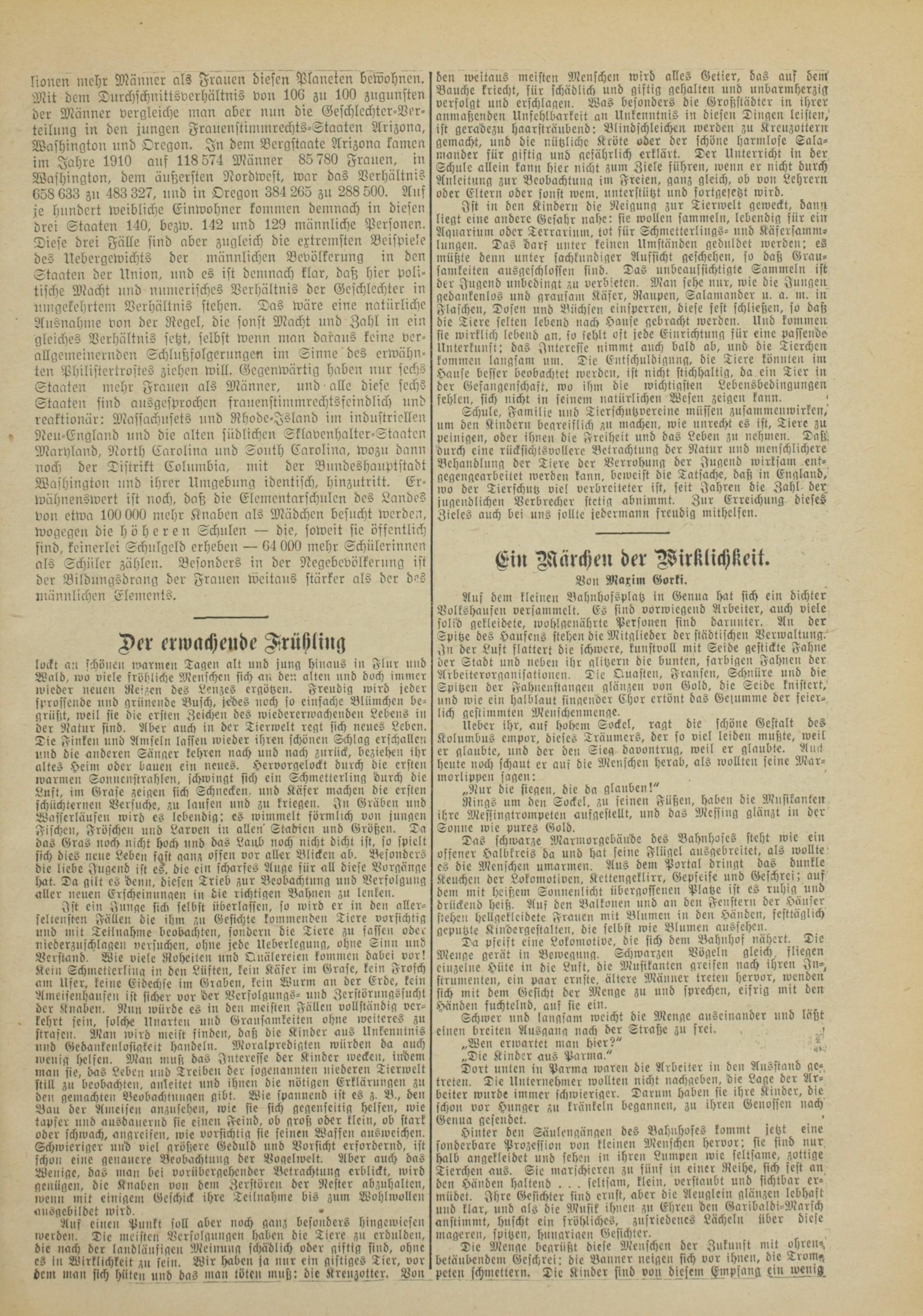 Iiouen mehr Männer als Frauen diesen Planeten bewohnen. Mit dem Durchschnittsverhältnis von 106 zu 100 zugunsten der Männer vergleiche man aber nun die Geschlcchtcr-Ver- teilung in den jungen Frauenstimmrechts-Staaten Arizona, Washington und Oregon. In dem Bergstaate Arizona kamen im Jahre 1910 auf 118 574 Männer 85 780 Frauen, in Washington, dem äußersten Nordwest, war das Verhältnis 658 633 zu 483 327, und in Oregon 384 265 zu 288 500. Auf je hundert weibliche Einwohner kommen demnach in diesen drei Staaten 140, bezw. 142 und 129 männliche Personen. Diese drei Fälle sind aber zugleich die extremsten Beispiele des Uebergcwichts der männlichen Bevölkerung in den Staaten der Union, und es ist demnach klar, daß hier politische Macht und numerisches Verhältnis der Geschlechter in umgekehrtem Verhältnis stehen. Das wäre eine natürliche Ausnahme von der Regel, die sonst Macht und Zahl in ein gleiches Verhältnis setzt, selbst wenn man daraus keine verallgemeinernden Schlußfolgerungen im Sinne des erwähnten Philistertrostes ziehen will. Gegenwärtig haben nur sechs Staaten mehr Frauen als Männer, und • alle diese sechs Staaten sind ausgesprochen frauenstimmrcchtsfcindlich und reaktionär: Massachusets und Rhodc-Jsland im industriellen Neu-England und die alten südlichen Sklavenhalter-Staaten Maryland, North Carolina und South Carolina, wozu dann noch der Distrikt Columbia, mit der Bundeshauptstadt Washington und ihrer Umgebung identisch, hinzutritt. Erwähnenswert ist noch, daß die Elementarschulen des Landes von etwa 100 000 mehr Knaben als Mädchen besucht werden, wogegen die höheren Schulen — die, soweit sie öffentlich sind, keinerlei Schulgeld erheben — 64 000 mehr Schülerinnen als Schüler zählen. Besonders in der Negebevölkerung ist der Bildungsdrang der Frauen weitaus stärker als der des ulänulichen Elements.