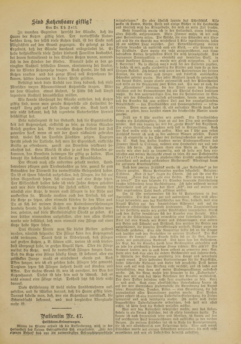 In manchen Gegenden herrscht der Glaube, daß die Haare der Katzen giftig seien. Der vortreffliche Naturforscher Lenz, der selbst viele Katzen hielt, ist der Sache nach Möglichkeit auf den Grund gegangen. Er gelangt zu dem Ergebnis, daß der Glaube durchaus unbegründet sei. Ec habe beispielsweise viele Jahre hindurch Familien beobachtet, bei denen fortwährend in den Stuben Katzen waren, namentlich in den Händen der Kinder. Niemals habe er den geringsten Nachteil feststellen können, ebensowenig bei Leuten, die im Winter Katzenpelze trugen. Auch Hunde, die sich mit Katzen rauften und das ganze Maul voll Katzenhaare bekamen, hätten darunter in keiner Weise gelitten.