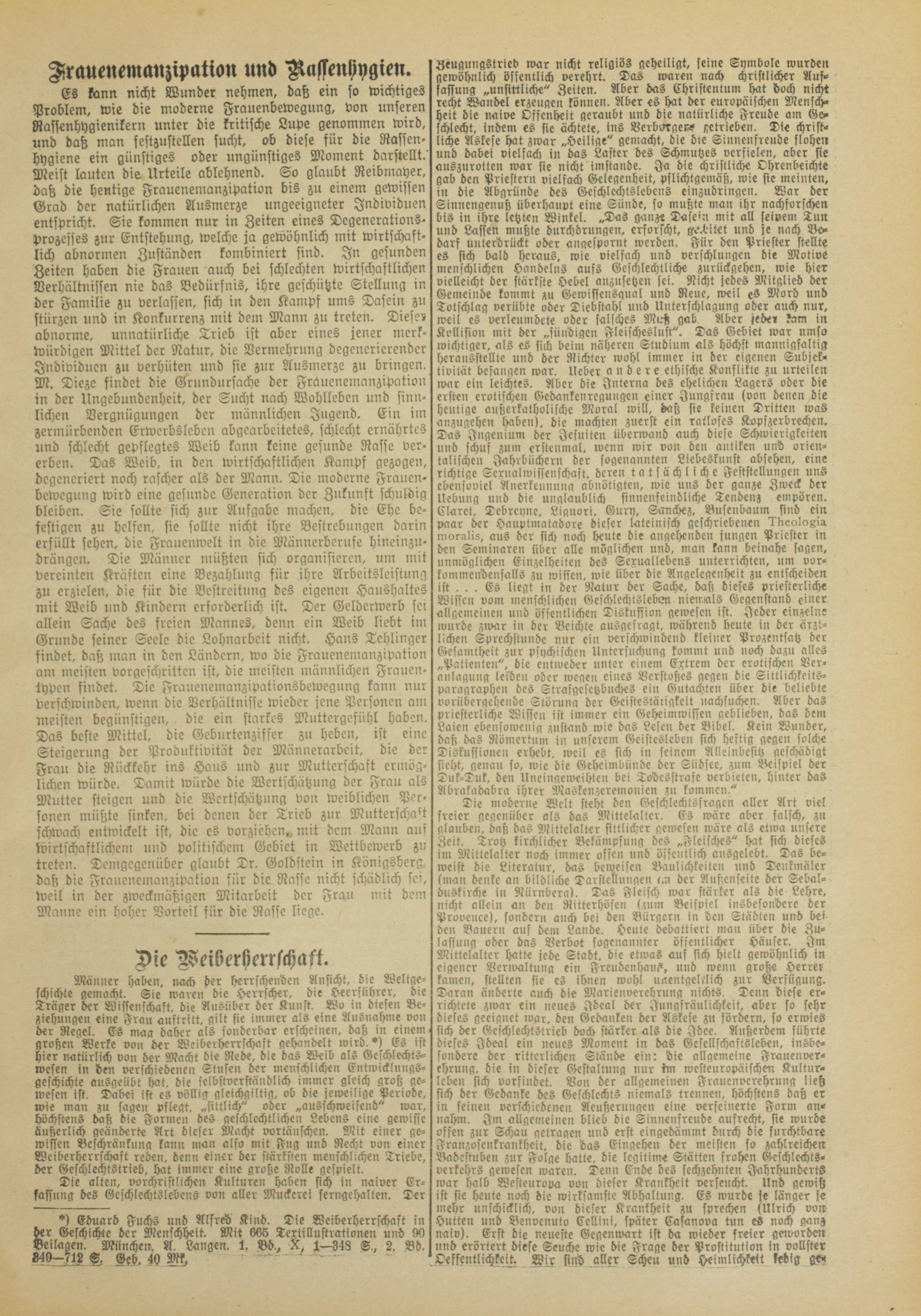 *> Eduard Fuchs und Alfred Kind. Die Weiberherrschast in der Geschichte der Menschheit. Mit 666 Tertillustrationen uni 90 Beilagen. München. A. Langen. 1. vd., X, l—348 S., 2. Bd. 849—712 S. GO. 40 M, ' ’
