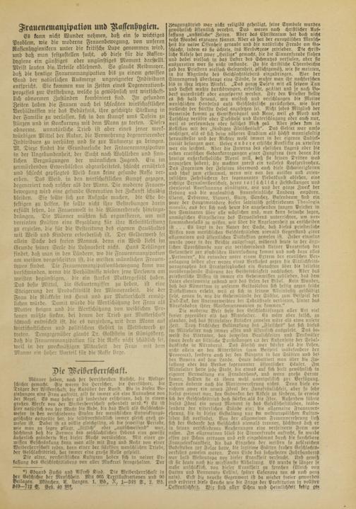 Es kann nicht Wunder nehmen, daß ein so wichtiges Problem, wie die moderne Frauenbewegung, von unseren Rassenhygienikern unter die kritische Lupe genommen wird, und daß man festzustellen sucht, ob diese für die Rasscn- hygiene ein günstiges oder ungünstiges Moment darstellt. Meist lauten die Urteile ablehnend. So glaubt Reibmayer, daß die heutige Frauenemanzipation bis zu einem gewissen Grad der natürlichen Ausmerze ungeeigneter Individuen entspricht. Sie kommen nur in Zeiten eines Degenerations- Prozesses zur Entstehung, welche ja gewöhnlich mit Wirtschaft- lich abnormen Zuständen kombiniert sind. In gesunden Zeiten haben die Frauen auch bei schlechten wirtschaftlichen Verhältnissen nie das Bedürfnis, ihre geschützte Stellung in der Familie zu verlassen, sich in den Kampf ums Dasein zu stürzen und in Konkurrenz mit dem Mann zu treten. Diese; abnorme, unnatürliche Trieb ist aber eines jener merkwürdigen Mittel der Natur, die Vermehrung degenerierender Individuen zu verhüten und sie zur Ausmerze zu bringen. M. Dieze findet die Grundursache der Früucnemanzipation in der Ungebundcnheit, der Sucht nach Wohlleben und sinnlichen Vergnügungen der männlichen Jugend. Ein im zermürbenden Erwerbsleben abgcarbcitetes, schlecht ernährtes und schlecht gepflegtes Weib kann keine gesunde Rasse ver- erben. Das Weib, in den wirtschaftlichen Kampf gezogen, degeneriert noch rascher als der Mann. Die moderne Frauenbewegung wird eine gesunde Generation der Zukunft schuldig bleiben. Sie sollte sich zur Aufgabe machen, die Ehe befestigen zu helfen, sie sollte nicht ihre Bestrebungen darin erfüllt sehen, die Frauenwelt in die Männerberuse hineinzn- drängcn. Die Männer müßten sich organisieren, um mit vereinten Kräften eine Bezahlung für ihre Arbeitsleistung zu erzielen, die für die Bestreitung des eigenen Haushaltes mit Weib und Kindern erforderlich ist. Der Gelderwerb sei allein Sache des freien Mannes, denn ein Weib liebt im Grunde seiner Seele die Lohnarbeit nicht. Hans Tehlinger findet, daß man in den Ländern, wo die Frauenemanzipation am meisten vorgeschritten ist, die meisten männlichen Frauentypen findet. Die Frauenemanzipationsbewegung kann nur verschwinden, wenn die Verhältnisse wieder jene Personen am meisten begünstigen, die ein starkes Muttergcfühl haben. Das beste Mittel, die Geburtenziffer zu heben, ist eine Steigerung der Produktivität der Männerarbcit, die de: Frau die Rückkehr ins Haus und zur Mutterschaft ermöglichen würde. Damit würde die Wertschätzung der Frau als Mutter steigen und die Wertschätzung von weiblichen Personen müßte sinken, bei denen der Trieb zur Mutterschaft schwach entwickelt ist, die cs vorziehcn^ mit dem Mann aut wirtschaftlichen! und politischem Gebiet in Wettbewerb zu treten. Demgegenüber glaubt Dr. Goldstein in Königsberg, daß die Fraueneinanzipation für die Rasse nicht schädlich sei, weil in der zweckmäßigen Mitarbeit der Frau mit dem Manne ein hoher Vorteil für die Rasse liege.