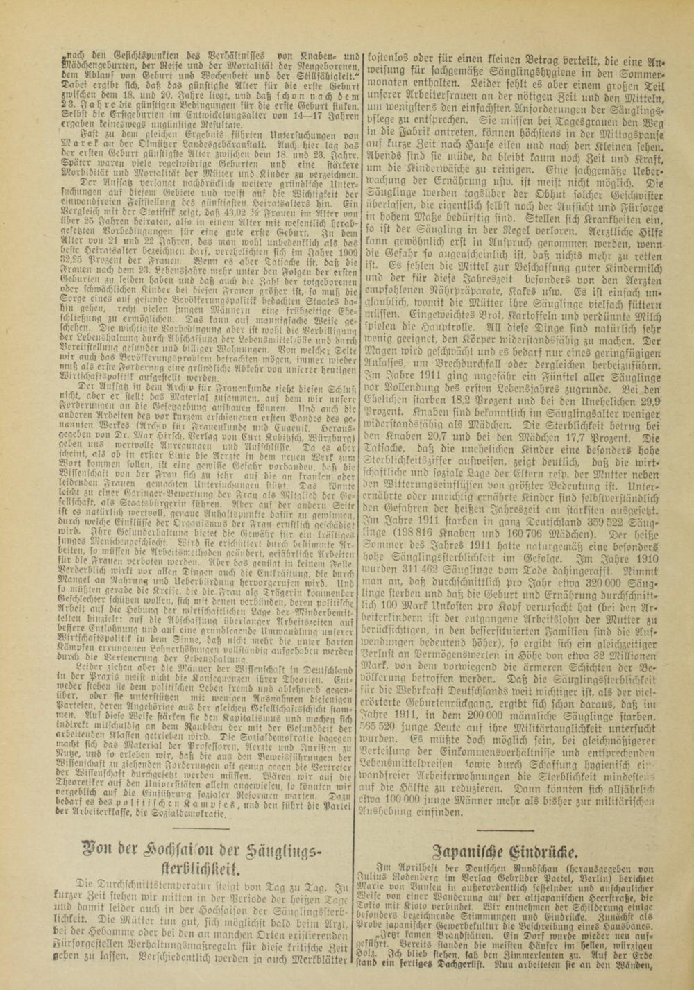 Fast zu dem gleichen Ergebnis führten Untersuchungen von Marek an der Olmützer Landesgebäranstalt, Auch hier lag das der ersten Geburt günstigste Alter zwischen dem 18, und 23, Jahre, Später waren viele regelwidrige Geburten und eine stärkere Morbidität und Mortalität der Mütter und Kinder zu verzeichnen. Der Anssatz verlangt nachdrücklich weitere gründliche Untersuchungen aus diesen, Gebiet« und weist aus die Wichligkeit der einwandfreien Feststellung des günstigsten Heiratsalters hin. Ein Vergleich mit der Statistik zeigt, daß 43,02 Vs Frauen im Alter von über 25 Jahren heiraten, also in einem Alter mit wesentlich herabgesetzten Vorbedingungen für eine gute erste Geburt, In dem Alter von 21 und 22 Jahren, das man wohl unbedenklich als das beste Heiratsalter bezeichnen darf, verehelichten sich im Jahre 1900 32,2ö Prozent der Frauen, Wenn es aber Tatsache ist, daß die Frauen nach dem 23, Lebensjahre mehr unter den Folgen der ersten Geburten zu leiden haben und daß auch die Zahl der totgeborenen oder schwächlichen Kinder bei diesen Frauen größer ist, so mutz die Sorge eines auf gesunde Bevölkerungspolitik bedachten Staates dahin gehen, recht vielen jungen Männern eine frühzeitige Eheschließung zu ermöglichen. Das kann auf mannigfache Weise geschehen, Die wichtigste Vorbedingung aber ist woh! die Verbilligung der Lebenshaltung durch Abschaijung der Lebensmittelzölle »nd durch Bereitstellung gesunder und billiger Wohnungen, Von welcher Seite wir auch das Revvlkerungsproolem betrachten mögen, immer wieder nniß als erste Forderung eine gründliche Abkehr von unserer heutigen Wirtschaftspolitik ausgestellt werden.