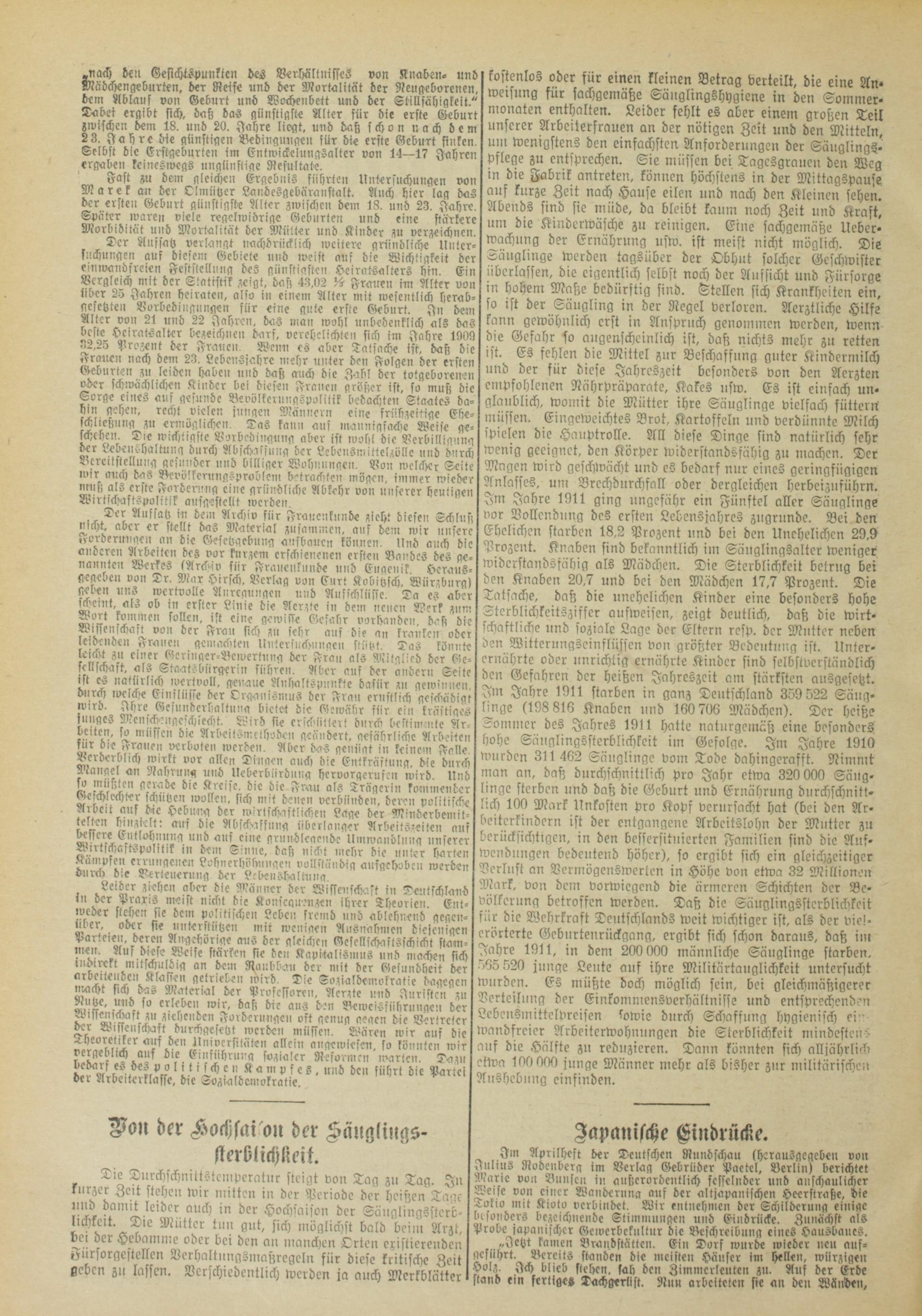 kostenlos oder für einen kleinen Betrag verteilt, die eine Anweisung für sachgemäße Sänglingshygiene in den Sommer- nionaten enthalten. Leider fehlt es aber einem großen Teil unserer Arbeiterfrauen an der nötigen Zeit und den Mitteln, um wenigstens den einfachsten Anforderungen der Säuglingspflege zu entsprechen. Sie niüssen bei Tagcsgraue» den Weg in die Fabrik antreten, können höchstens in der Mittagspause auf kurze Zeit nach Hause eilen und nach den Kleinen sehen. Abends sind sie müde, da bleibt kaum noch Zeit und Kraft, um die Kindcrwäsche zu reinigen. Eine sachgemäße Ucber- wachung der Ernährung usw. ist meist nicht möglich. Die Säuglinge werden tagsüber der Obhut solcher Geschwister überlassen, die eigentlich selbst noch der Aussicht und Fürsorge in hohem Maße bedürftig sind. Stellen sich Krankheiten ein, so ist der Säugling in der Regel verloren. Acrztlichc Hilfe kann gewöhnlich erst in Anspruch genommen werden, wenn die Gefahr so augenscheinlich ist, daß nichts mehr zu retten ist. Es fehlen die Mittel zur Beschaffung guter Kindermilch und der für diese Jahreszeit besonders von den Acrzten empfohlenen Nährpräparate, Kakes usw. Es ist einfach unglaublich, womit die Mütter ihre Säuglinge vielfach füttern müssen, Eingcweichtes Brot, Kartoffeln und verdünnte Milch spielen die Hauptrolle, All diese Dinge sind natürlich sehr wenig geeignet, den Körper widerstandsfähig zu machen. Der Magen wird geschlvächt und es bedarf nur eines geringfügigen Anlasses, um Brechdurchfall oder dergleichen herbeiznführn. Im Jahre 1911 ging ungefähr ein Fünftel aller Säuglinge vor Vollendung des ersten Lebensjahres zugrunde. Bei den Ehelichen starben 18,2 Prozent und bei den Unehelichen 29.9 Prozent. Knaben sind bekanntlich im Sünglingsaltcr weniger widerstandsfähig als Mädchen. Die Sterblichkeit betrug bei den Knaben 20,7 und bei den Mädchen 17,7 Prozent. Die Tatsache, daß die unehelichen Kinder eine besonders hohe Stcrblichkeitsziffcr aufweisen, zeigt deutlich, daß die wirtschaftliche und soziale Lage der Eltern rcsp. der Mutter neben den Witternngseinflüsscn von größter Bedeutung ist. Unterernährte oder unrichtig ernährte Kinder sind selbstverständlich den Gefahren der heißen Jahreszeit am stärksten ansgeseht. Im Jahre 1911 starben in ganz Deutschland 359 522 Säuglinge (198 816 Knaben und 160 706 Mädchen). Der heiße Sommer des Jahres 1911 hatte naturgemäß eine besonders hohe Säuglingssterblichkeit im Gefolge. Im Jahre 1910 wurden 311 462 Säuglinge vom Tode dahingerafft. Nimnit man an, daß durchschnittlich pro Jahr etwa 320 000 Säuglinge sterben und daß die Geburt und Ernährung durchschnitt- 'ich 100 Mark Unkosten pro Kopf verursacht hat (bei den Arbeiterkindern ist der entgangene Arbeitslohn der Mutter zu berücksichtigen, in den bessersitnicrten Familien sind die Aufwendungen bedeutend höher), so ergibt sich ein gleichzeitiger Verlust an Vermögenswerten in Höhe von etwa 32 Millionen Mark, von dem vorwiegend die ärmeren Schichten der Bevölkerung betroffen werden. Daß die Säuglingssterblichkeit für die Wehrkraft Deutschlands weit wichtiger ist, als der vie!- erörterte Geburtenrückgang, ergibt sich schon daraus, daß im Jahre 1911, in dem 200 000 männliche Säuglinge starben. 565 520 junge Leute auf ihre Militärtauglichkcit untersucht wurden. ES müßte doch möglich sein, bei gleichmäßigerer Verteilung der Einkomniensverhältnisse und entsprechenden LcbenSmittclPrcisen lowie durch Schaffung hygienisch ei" wandfreier Arbeitcrwohnnngen die Sterblickikeit mindestens auf die Hälfte zu reduzieren. Dann könnten sich alljährlich etlva 100 000 junge Männer mehr als bisher znr militärischen Aushebung cinfinden.