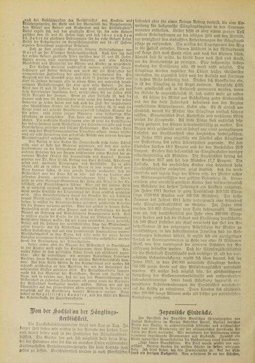 Tie Durchfchnittstcmperatiir steigt von Tag zu Tag. I» kurzer Zeit stehe» wir mitten in der Periode der heißen Tage lind damit leider auch in der Hochsaison der Säuglingssterblichkeit. Die Miittcr tun gut, sich möglichst bald beim Arzt, bei der Hebamme oder bei den an manchen Orten existierenden Fürsorgestellen Verhaltungsmaßregeln für diese kritische Zeit geben zu lassen. Verschiedentlich werden ja auch Merkblätter