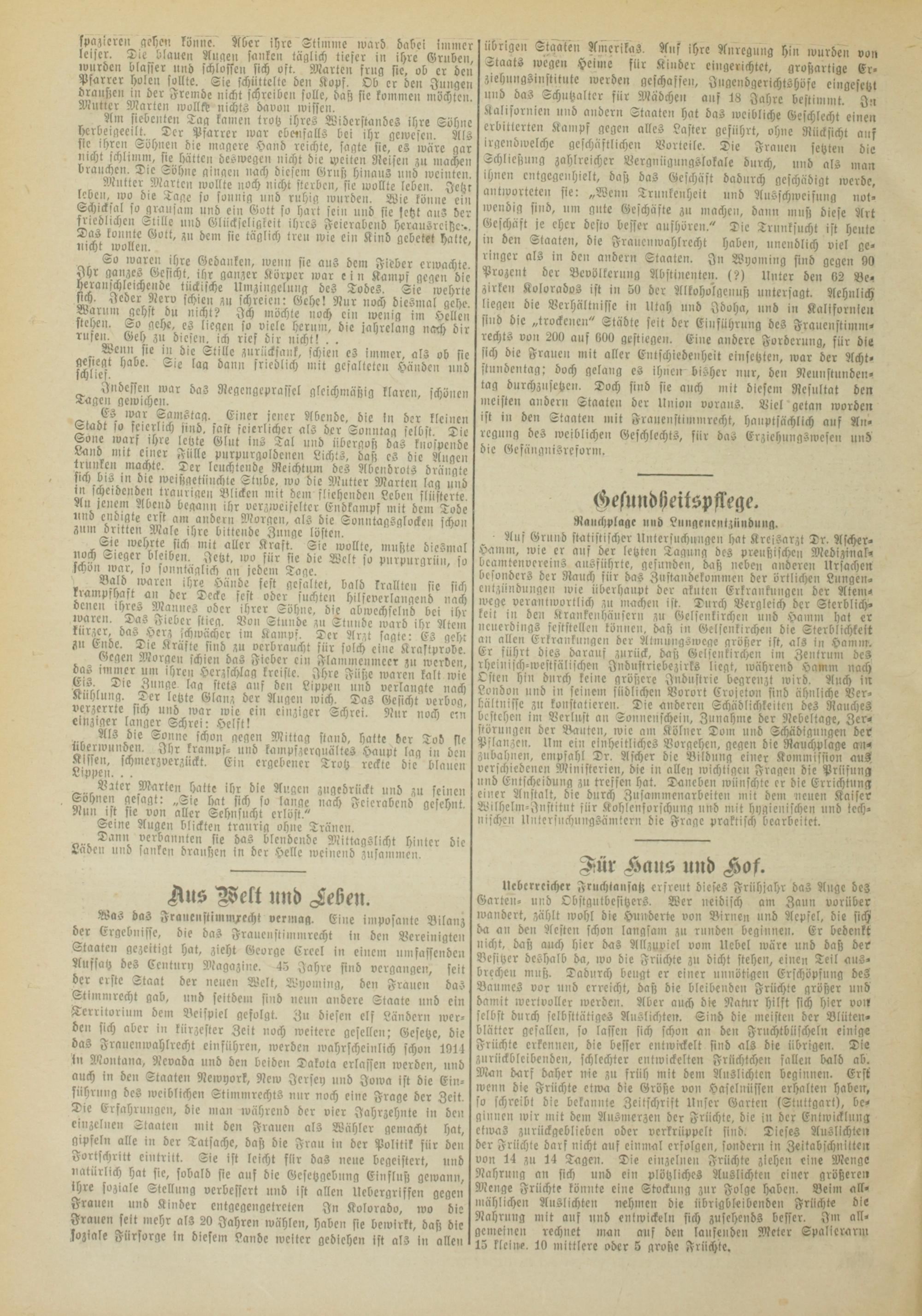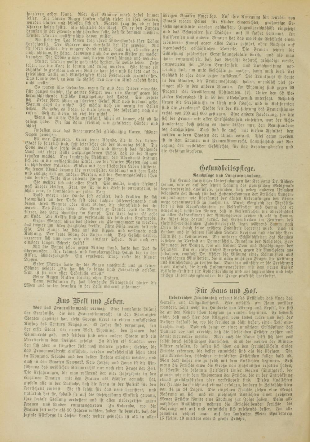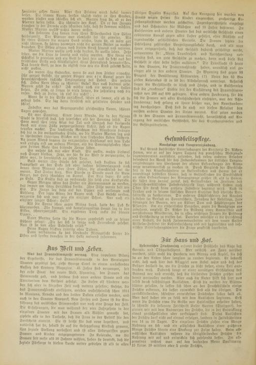 Was das Frauenstimmrecht vermag. Eine imposante Bilanz der Ergebniffe, die das Frauenstimmrecht in den Vereinigten Staaten gezeitigt hat, zieht George Creel in einem umfassenden Aufsatz des Century Magazine. 45 Jahre sind vergangen, seit der erste Staat der neuen Welt, Wyoming, den Frauen da-s Stimmrecht gab, und seitdem sind neun andere Staate und ein Territorium dem Beispiel gefolgt. Zu diesen elf Ländern werden sich aber in kürzester Zeit noch weitere gesellen; Gesetze, die das Frauenwahlrecht einfllhren, werden wahrscheinlich schon 1914 in Montana, Nevada und den beide» Dakota erlaffen werden, nnd auch in den Staaten Newyork, New Jersey und Iowa ist die Einführung des weiblichen Stimmrechts nur noch eine Frage der Zeit. Die Erfahrungen, die man während der vier Jahrzehnte in den einzelnen Staaten mit den Frauen als Wähler gemacht hat, gipfeln alle in der Tatsache, daß die Frau in der Politik sür den Fortschritt eintritt. Sie ist leicht für bas neue begeistert, und natürlich hat sie, sobald sie auf die Gesetzgebung Einfluß gewann, ihre soziale Stellung verbessert und ist allen liebergriffen gegen Frauen und Kinder entgegengetreten In Kolorado, wo die Frauen seit mehr als 20 Jahren wählen, haben sie bewirkt, daß die .soziale Fürsorge In diesem Lande weiter gediehen ist als in allen