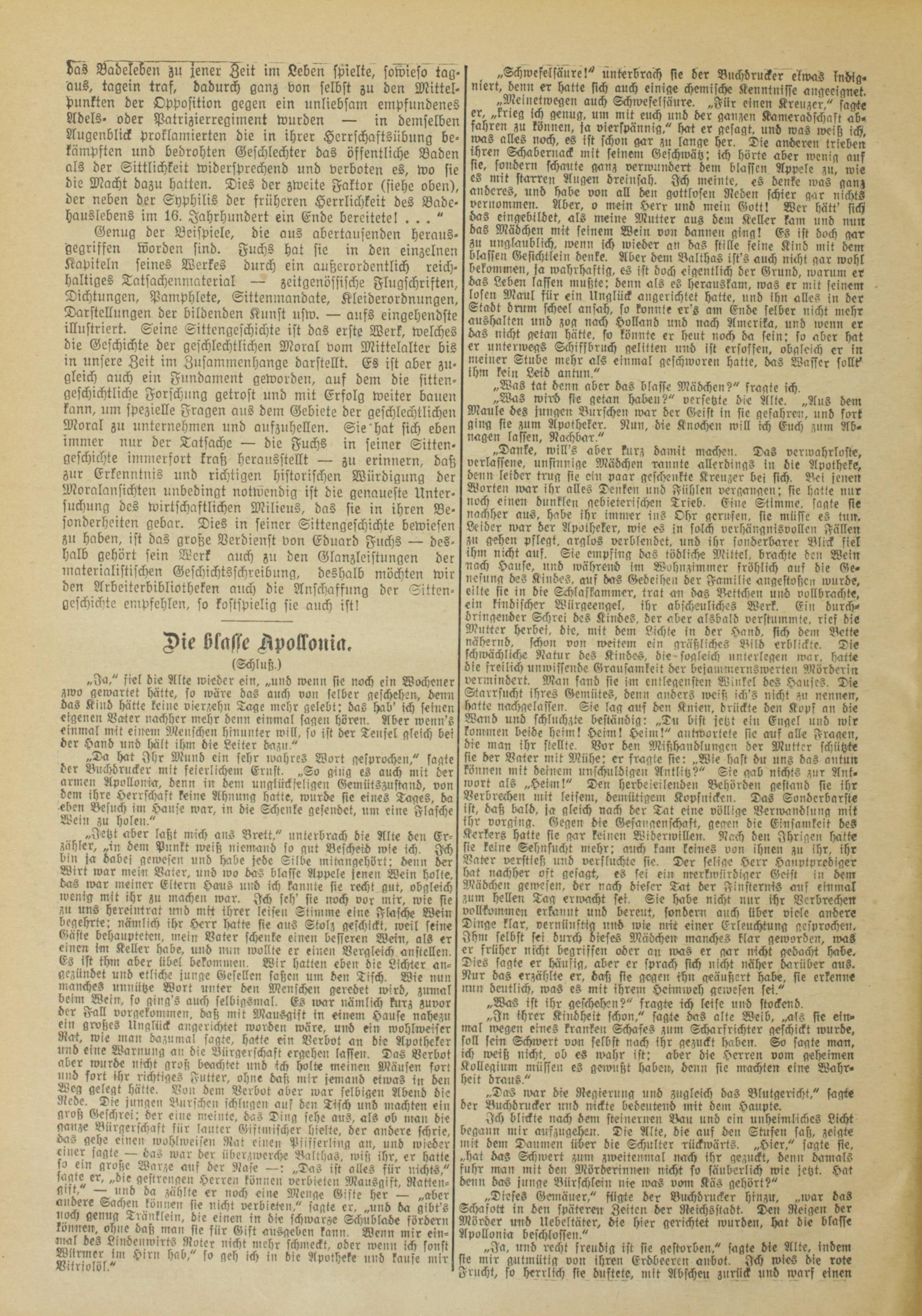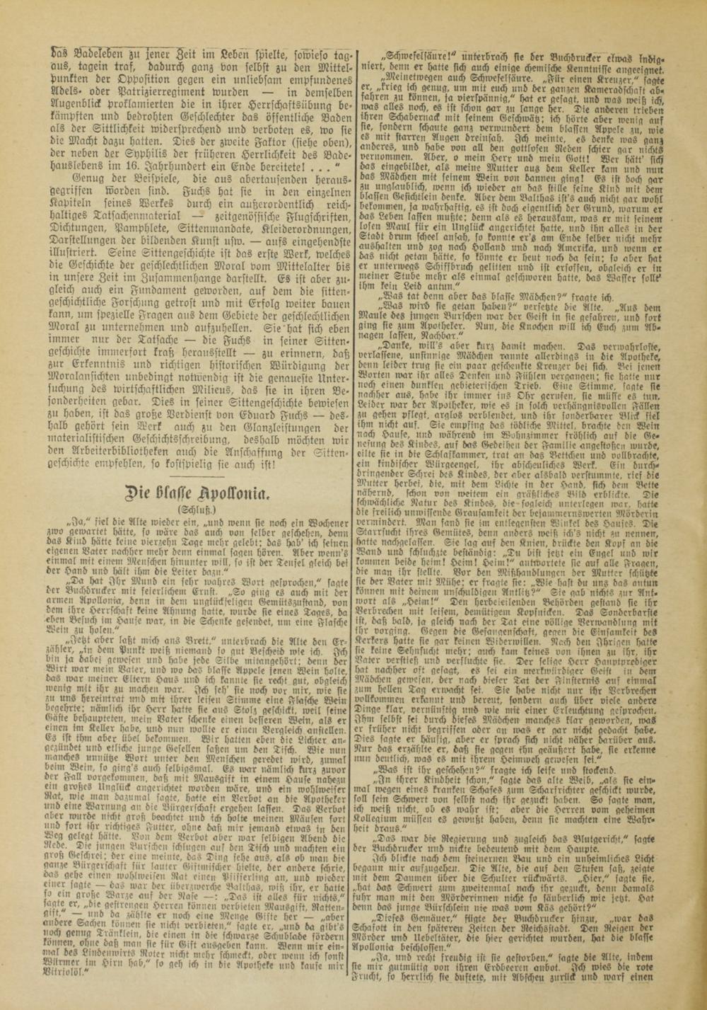 „Da hat Ihr Mund ein sehr roahres Wort gesprochen," sagte der Buchdrucker mit feierlichem Ernst. „So ging es auch mit der armen Apollonia, denn in den, unglückseligen Gemütszustand, von dem ihre Herrschaft keine Ahnung hatte, wurde sic eines Tages, da eben Besuch im Haus« war, in die Schenk« gesendet, um eine Flasche Wein zu holen."