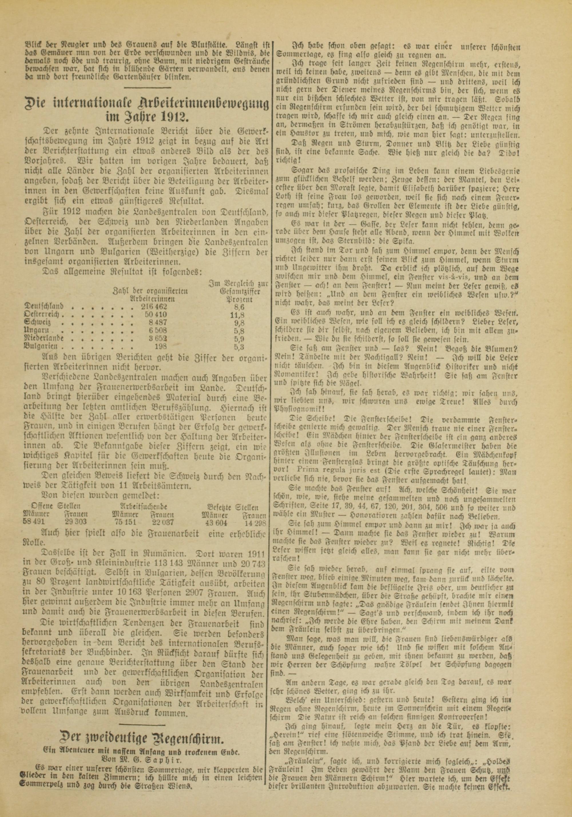 Verschiedene Landeszentralen machen auch Angaben über den Umfang der Frauenerwerbsarbeit im Lande. Deutschland bringt hierüber eingehendes Material durch eine Bearbeitung der letzten amtlichen Berufszählung. Hiernach ist die Hälfte der Zahl aller erwerbstätigen Personen heute Frauen, und in einigen Berufen hängt der Erfolg der gewerkschaftlichen Aktionen wesentlich von der Haltung der Arbeiter- innen ab. Die Bekanntgabe dieser Ziffern zeigt, ein wie wichtiges Kapitel für die Gewerkschaften heute die Organisierung der Arbeiterinnen sein muß.