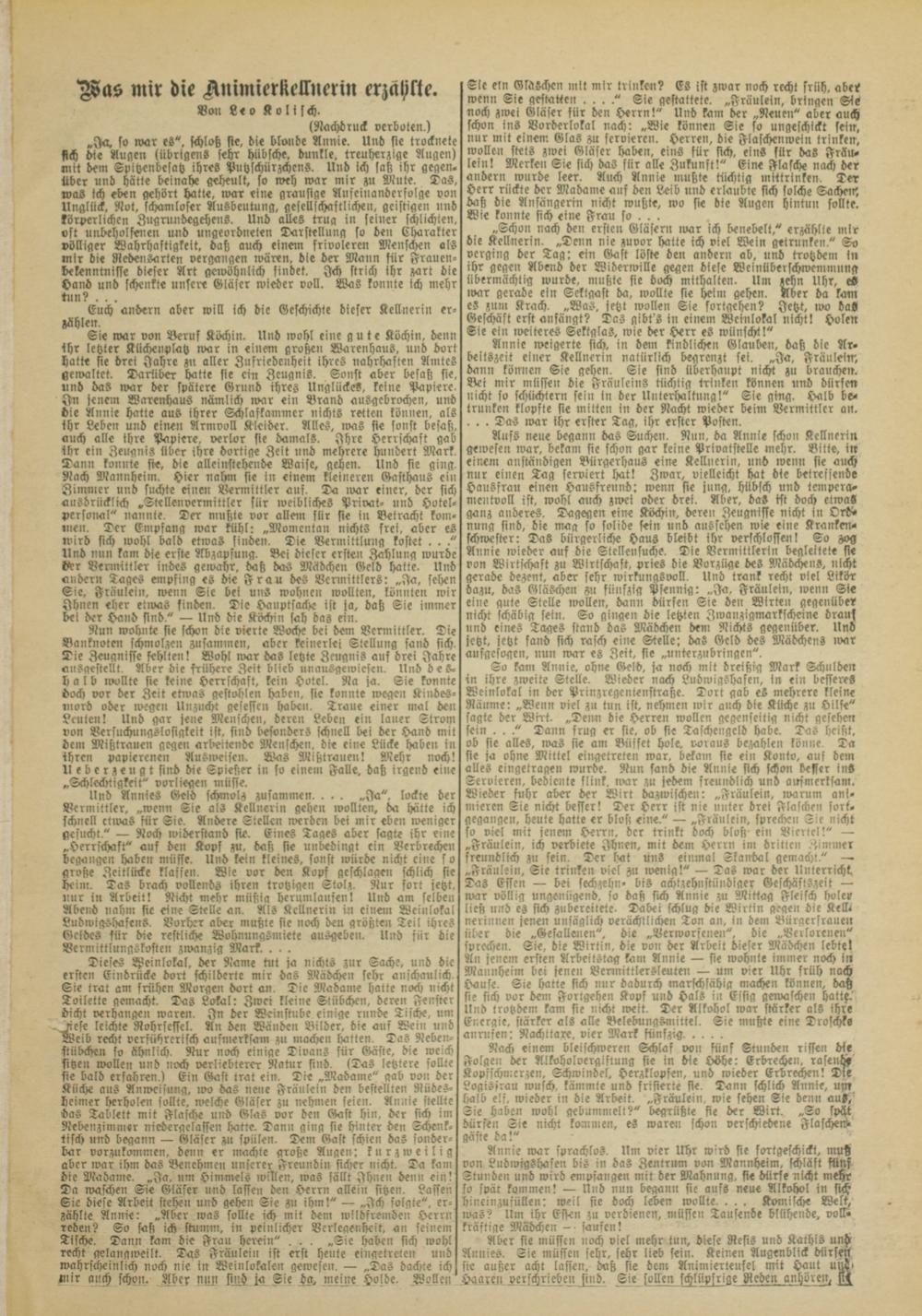Nach einem bleischweren Schlaf von fünf Stunden rissen die Folgen der Alkoholvergiftung sie in die Höhe: Erbrechen, rasend, Kopfschmerzen, Schwindel, Herzklopfen, und wieder Erbrechen! Die Logissrau wusch, kämmte und frisierte sie. Dann schlich Annie, um halb elf, wieder in die Arbeit. „Fräulein, wie sehen Sic denn au», Sie haben wohl gebummelt?" begrüßt« sie der Wirt. „So spät dürfen Sie nicht kommen, es waren schon verschiedene Flaschend« gäste da!"