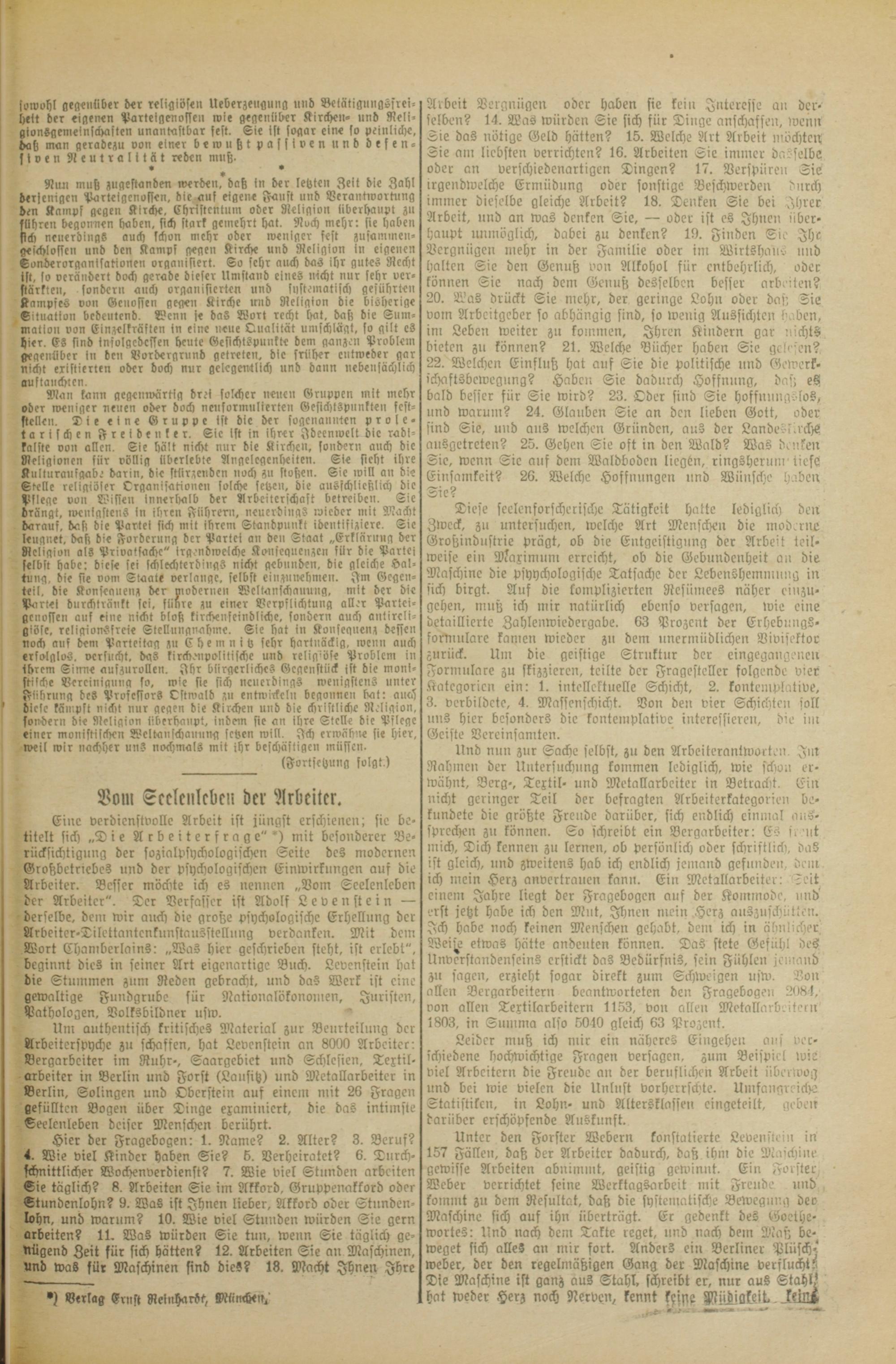 20. Was drückt Sie mehr, der geringe Lohn oder daß Sie vom Arbeitgeber so abhängig sind, so wenig Aussichten haben, im Leben weiter zu kommen, Ihren Kindern gar nichts bieten zu können? 21. Welche Bücher haben Sie gelesen? 22. Welchen Einfluß hat auf Sie die politische und Gewerk— schaftsbewegung? Haben Sie dadurch Hoffnung, daß es bald besser für Sie wird? 23. Oder sind Sie hoffnungslos, und warum? 24. Glauben Sie an den lieben Gott, oder sind Sie, und aus welchen Gründen, aus der Landeskirche ausgetreten? 25. Gehen Sie oft in den Wald? Was denken Sie, wenn Sie auf dem Waldboden liegen, ringsherum tiefe Einsamkeit? 26. Welche Hoffnungen und Wünsche haben Sie?