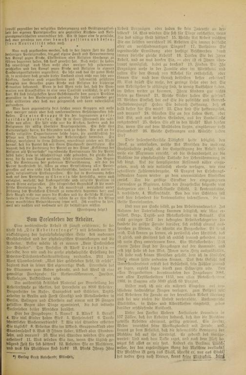 Leider muß ich mir ein näheres Eingehen auf ver- schiedene hochwichtige Fragen versagen, zum Beispiel wie viel Arbeitern die Freude an der beruflichen Arbeit überwog und bei wie vielen die Unlust vorherrschte. Umfangreiche Statistilen, in Lohn- und Altersklassen eingeteilt, geben darüber erschöpfende Auskunft.