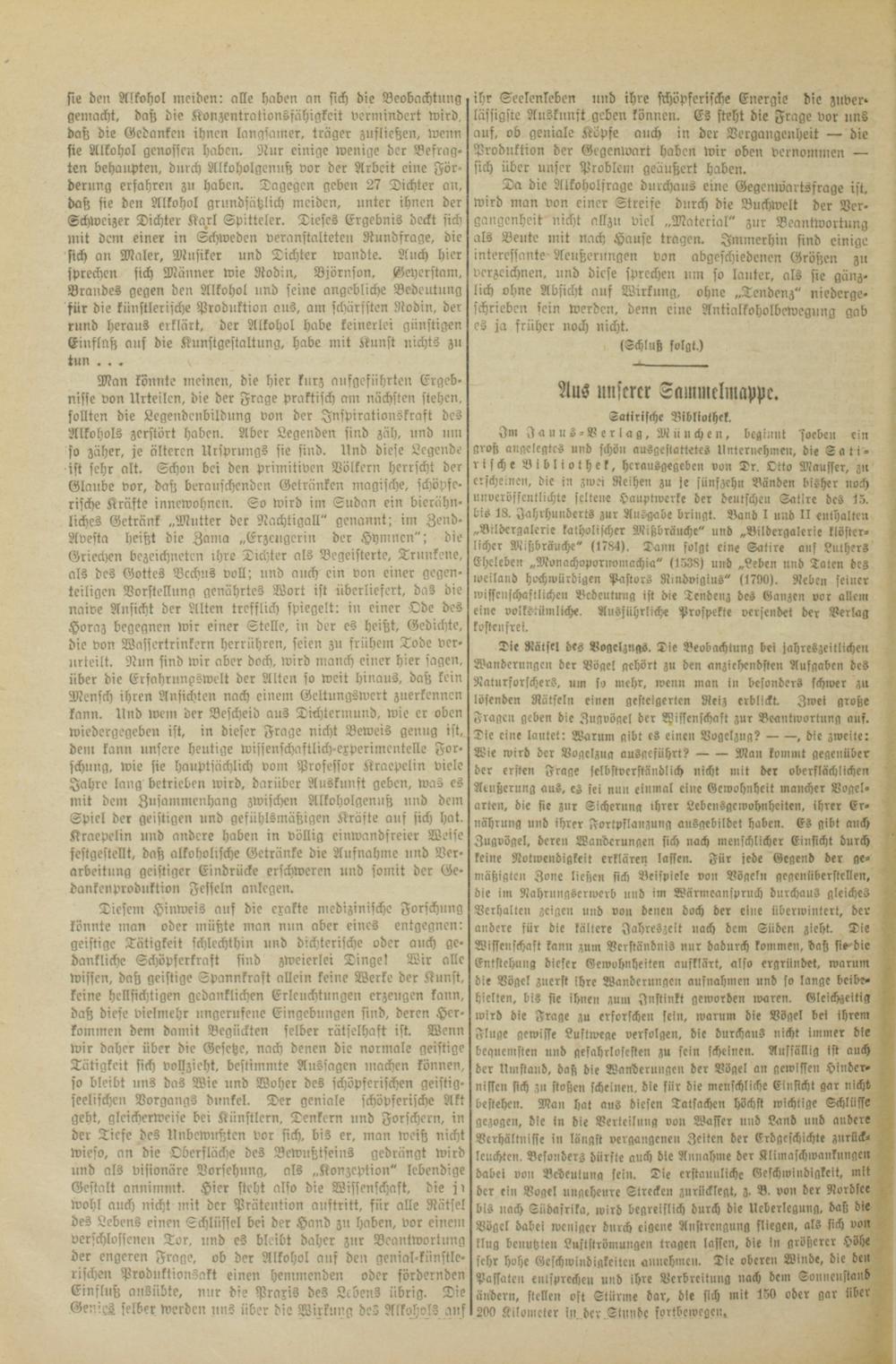 Satirische Bibliothek. 5 Im Janus-Verlag, München, beginnt soeben ein groß angelegtes und schön ausgestattetes Unternehmen, die Sati⸗ rische Bibliothek, herausgegeben von Dr. Otto Mausser, 6. erscheinen, die in zwei Reihen zu je fünfzehn Bänden bisher noch unverössentlichte seltene Hauptwerke der deutschen Satire des 15. bis 18. Jahrhunderts zur Ausgabe bringt. Band 1 und II enthalten „Bildergalerie katholischer Mißbräuche“ und„Bildergalerie kloster- a licher Mißbräuche“(1784). Dann solgt eine Satire auf Luthers Eheleben„Monachopornomachia“(1538) und„Leben und Taten des 5 weiland hochwürdigen Pastors Rindvigius“(1790). Neben seiner wissenschaftlichen Bedeutung ist die Tendenz des Ganzen vor allem eine volkstümliche. Ausführliche Prospekte versendet der Verlag 4 kostenfrei. l Die Rätsel des Vogelzugs. Die Beobachtung bei jahreszeitlichen Wanderungen der Vögel gehört zu den anziehendsten Aufgaben des Naturforschers, um so mehr, wenn man in besonders schwer zu lösenden Rätseln einen gesteigerten Reiz erblickt. Zwei große 3 Fragen geben die Zugvögel der Wissenschaft zur Beantwortung auf. 1
